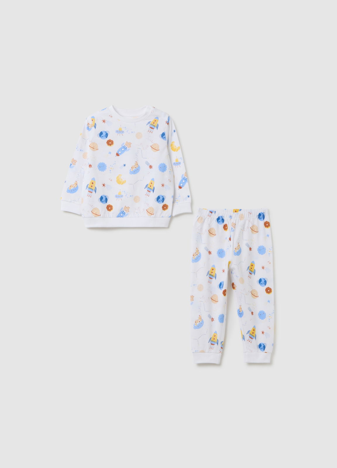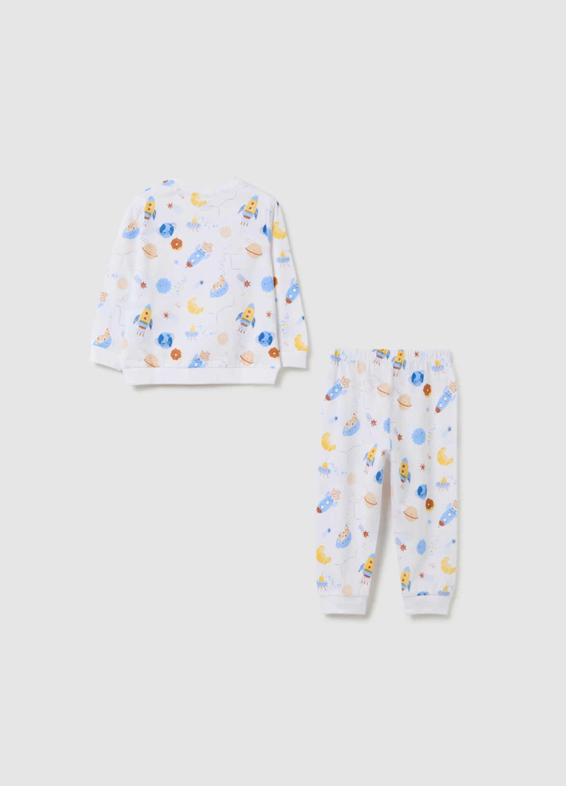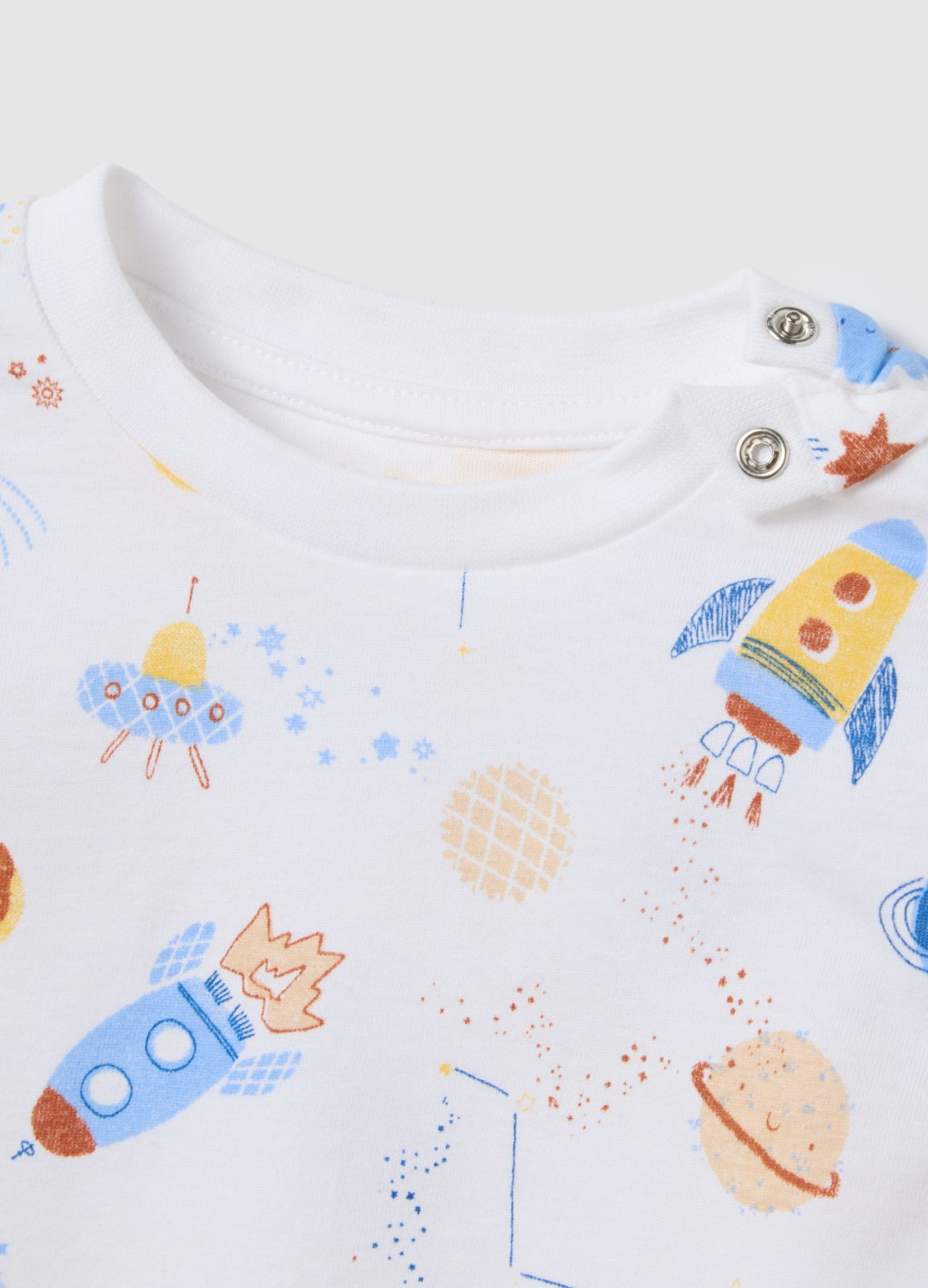Caracteristici: Pijamalele pentru copii din linia Fagottino sunt perfecte pentru cei mici, realizate din bumbac organic pur și decorate cu un design vibrant tematic spațial, cu rachete și planete colorate. Modelul lung este ideal pentru nopțile mai răcoroase, oferind confort și o senzație plăcută pe piele. Croiala regular fit adaugă o notă de culoare și veselie garderobei pentru somn a copiilor.