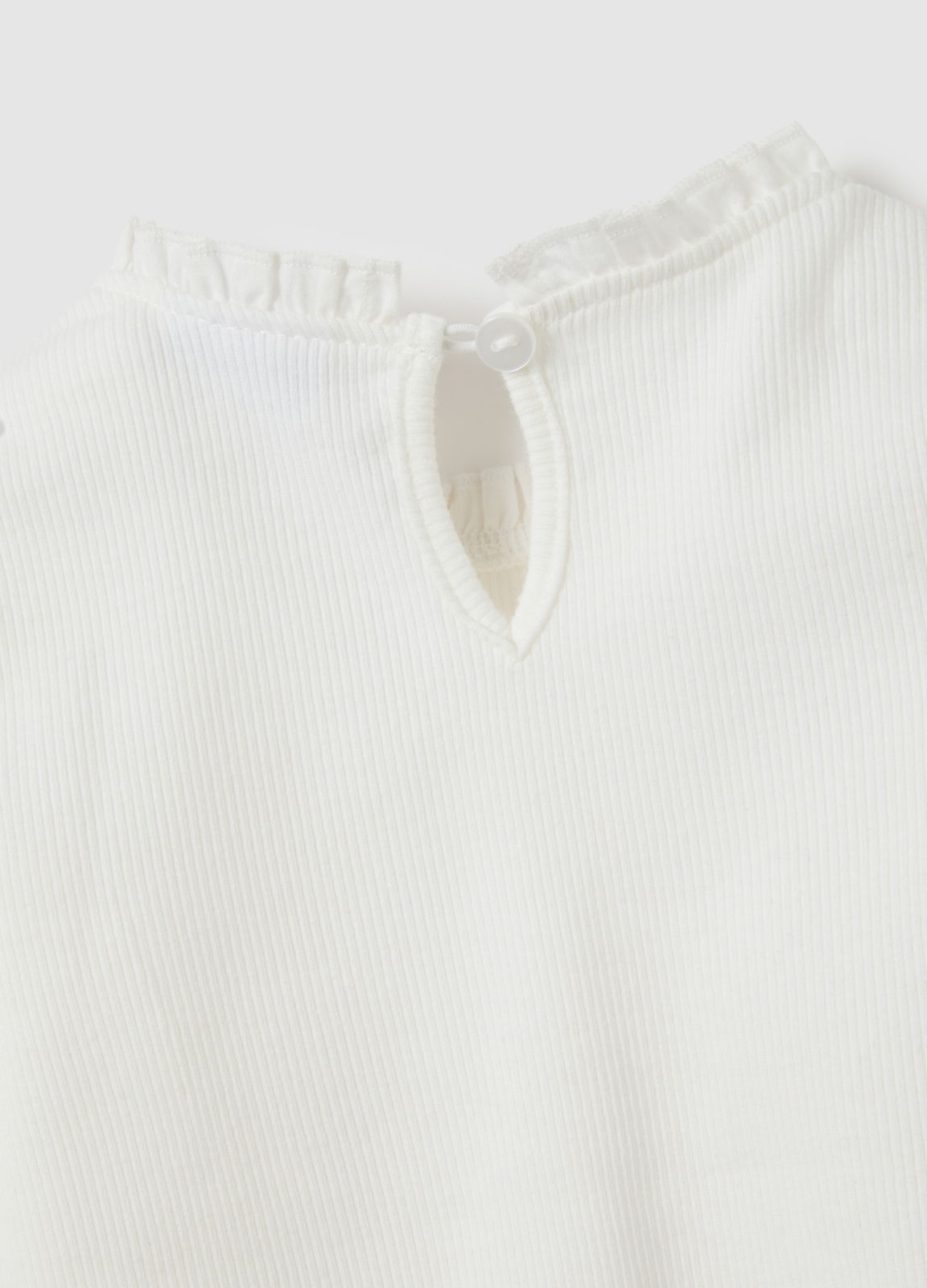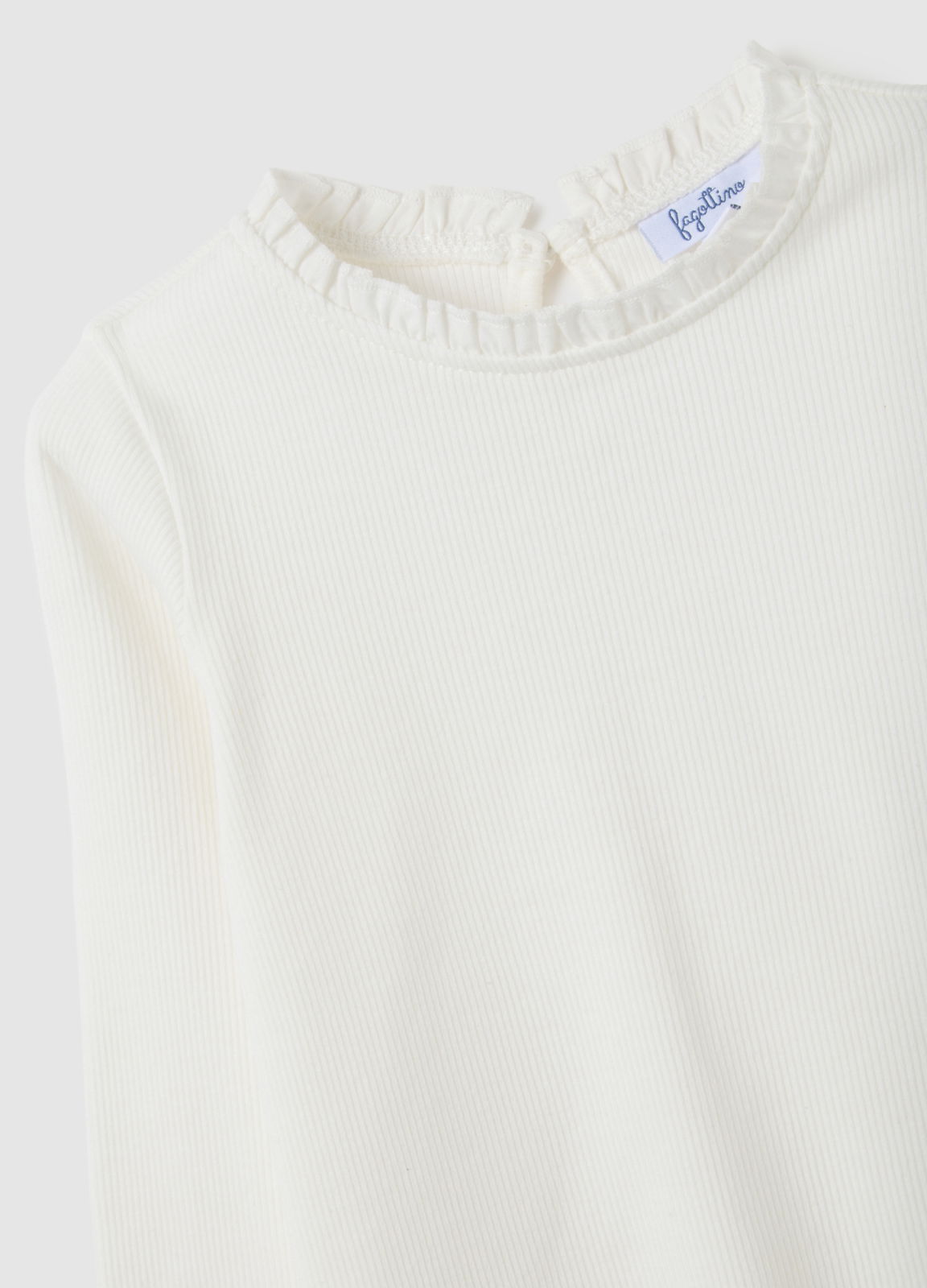 Caracteristici: Tricoul alb cu mânecă lungă din linia Fagottino este realizat din bumbac elastic, oferind finețe și confort ideal pentru fete cu vârsta între 9 și 36 de luni. Croiala regular cu guler rotund îl face perfect pentru sezoanele de toamnă și iarnă, garantând căldură și respirabilitate. Un detaliu încrețit la guler și tiv adaugă o notă de stil rafinat, iar închiderea cu nasture la spate facilitează îmbrăcarea.