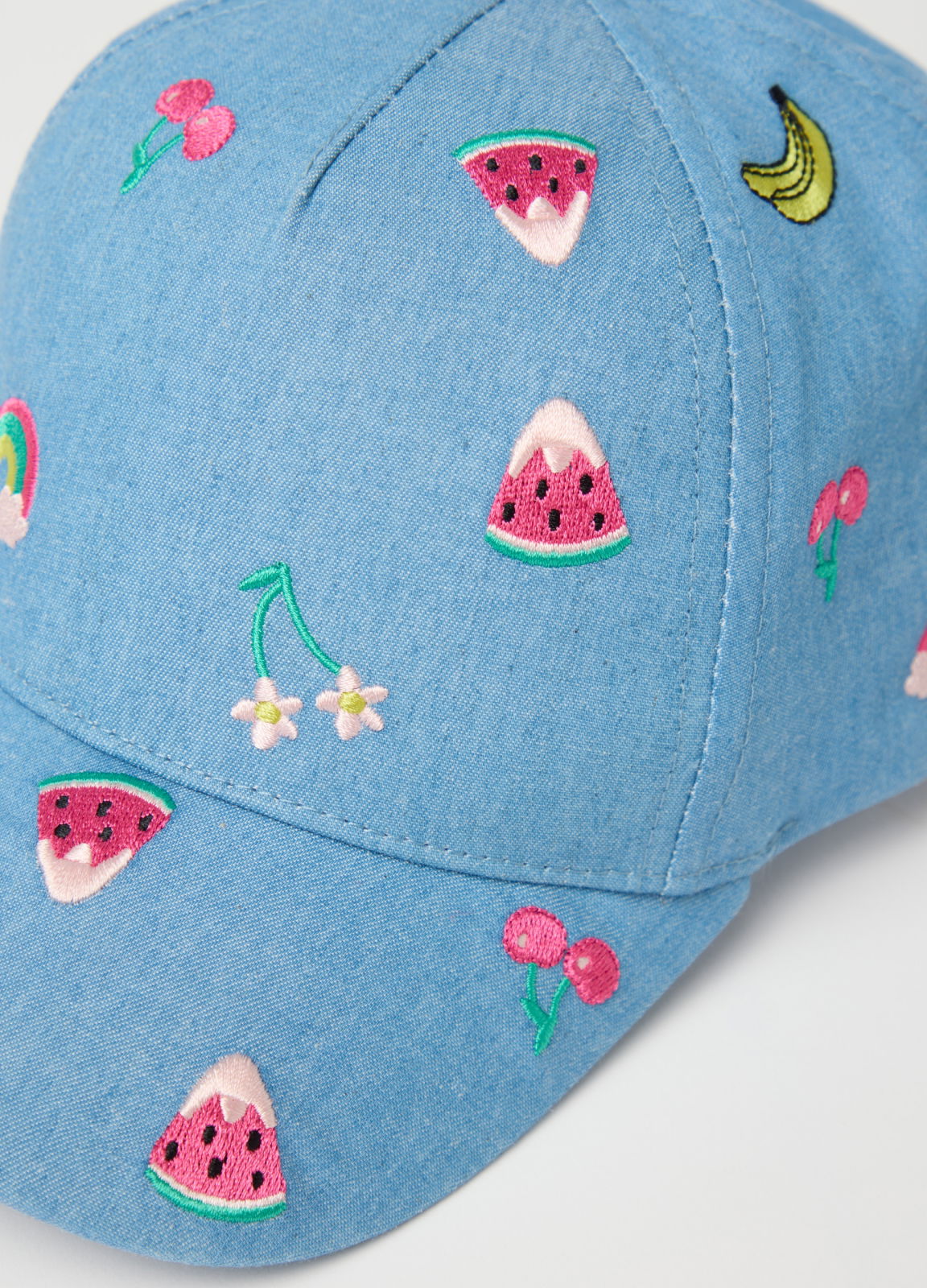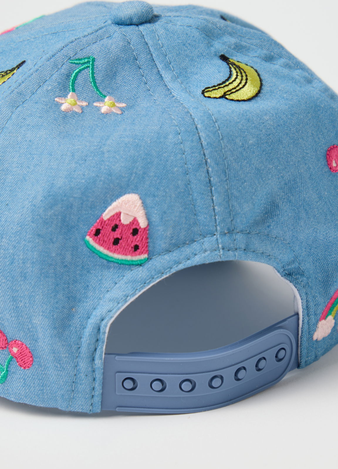 Caracteristici: Șapcă de baseball din denim 100% bumbac. Imprimeu cu flori, fructe și curcubeu pe toată suprafața. Curea reglabilă la spate.