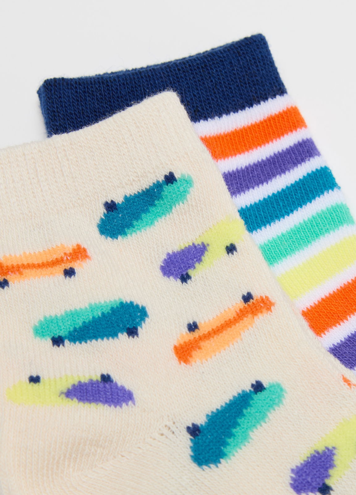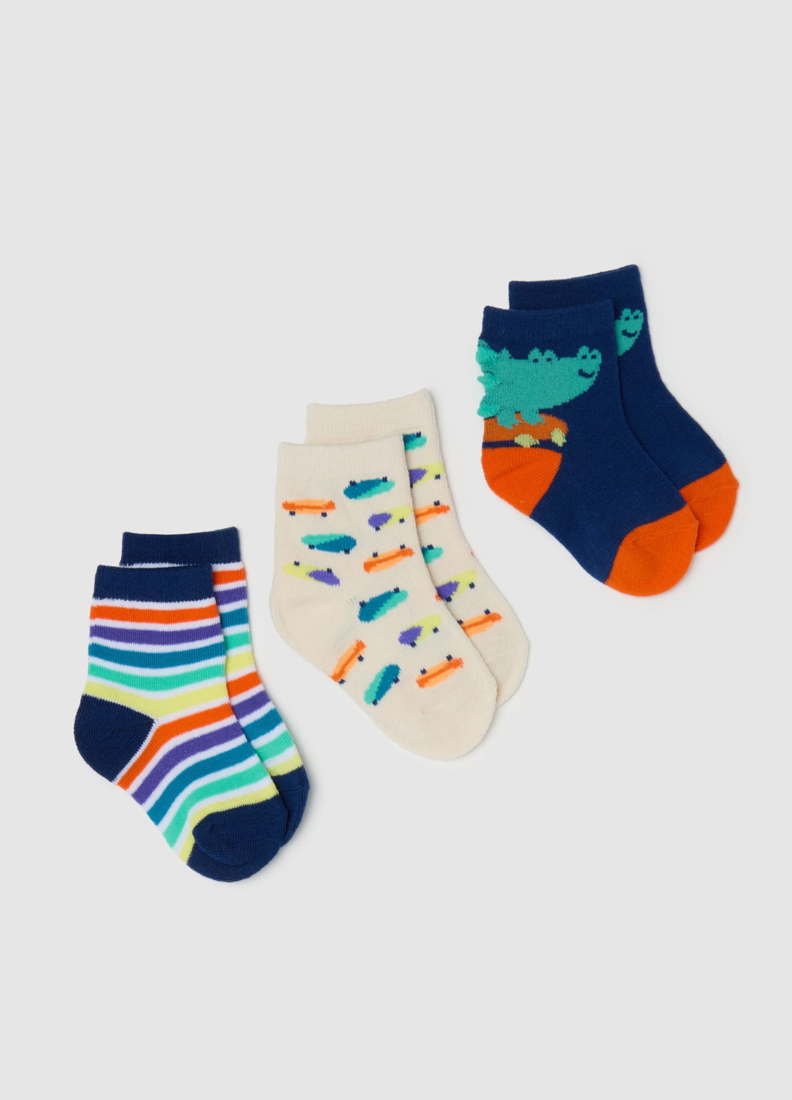 Caracteristici: Șosete tip pachet de trei perechi, din amestec de bumbac elastic. O pereche cu model cu dungi multicolore, o pereche cu design cu skateboard-uri și o pereche cu design cu crocodil și skater.