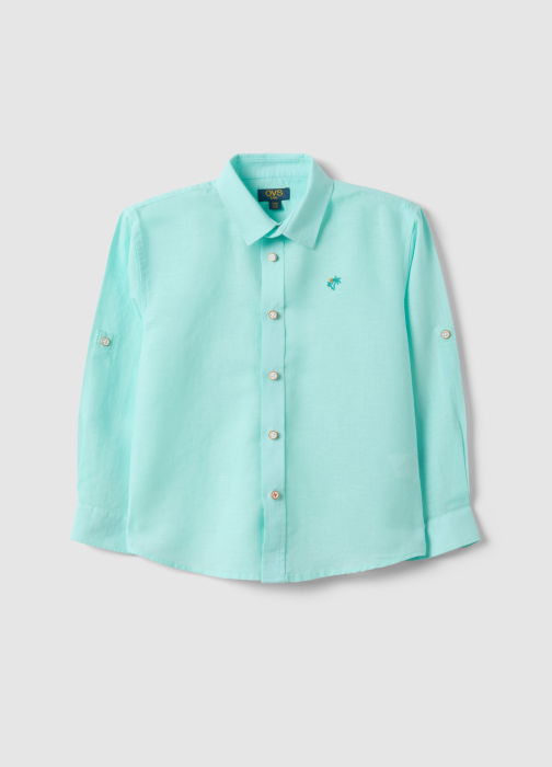 Caracteristici: Cămașa albastră cu amestec de in și bumbac, linia OVS KIDS, pentru copii 3-10 ani, ideală pentru primăvară-vară. Croială regular și guler clasic pentru confort și practicitate. Cu nasturi și mâneci lungi, garantează potrivirea optimă. Ideală pentru ocazii casual și semi-formale, oferind un look versatil și proaspăt.