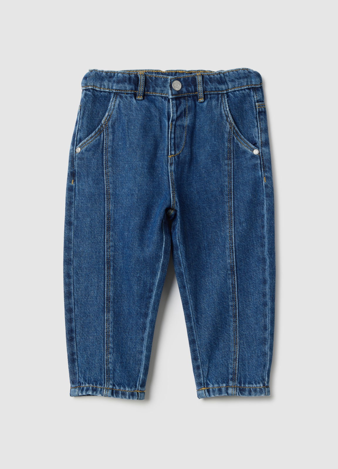 Caracteristici: Pantaloni albastru denim din linia Fagottino, bumbac 100%, pentru copii între 9 și 36 luni. Talie ajustabilă și croială normală, buzunare laterale și în spate, confort și funcționalitate pentru activitățile zilnice.