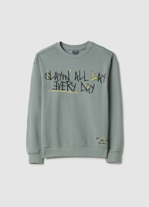 Caracteristici: Bluza verde din linia OVS KIDS pentru băieți cu vârste între 10 și 15 ani este confecționată din bumbac 100% și oferă confort optim datorită croielii oversize. Perfectă pentru sezonul de primăvară, include mâneci lungi și guler rotund, fiind un articol versatil pentru orice ocazie, completat de imprimeul frontal.