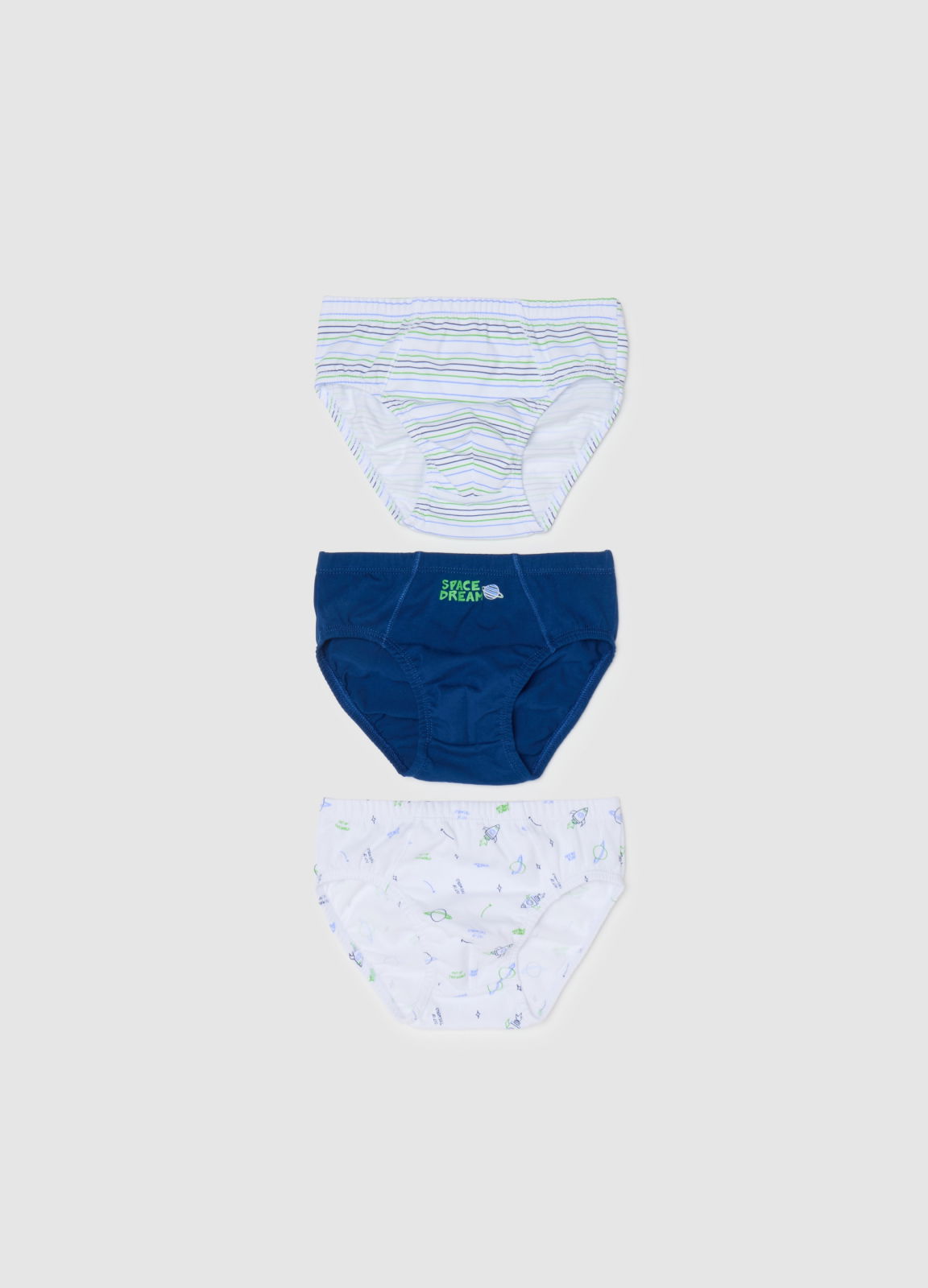 Caracteristici: Acest set de 3 chiloți din gama OVS KIDS pentru copii cu vârste între 3 și 8 ani are trei variante de design inspirate din spațiu. Realizați din bumbac pur, fiecare model are dungi vesele și motive spațiale care stimulează imaginația, cu textul „Space Dream”. Perfecți pentru a aduce veselie și confort pe tot parcursul zilei.