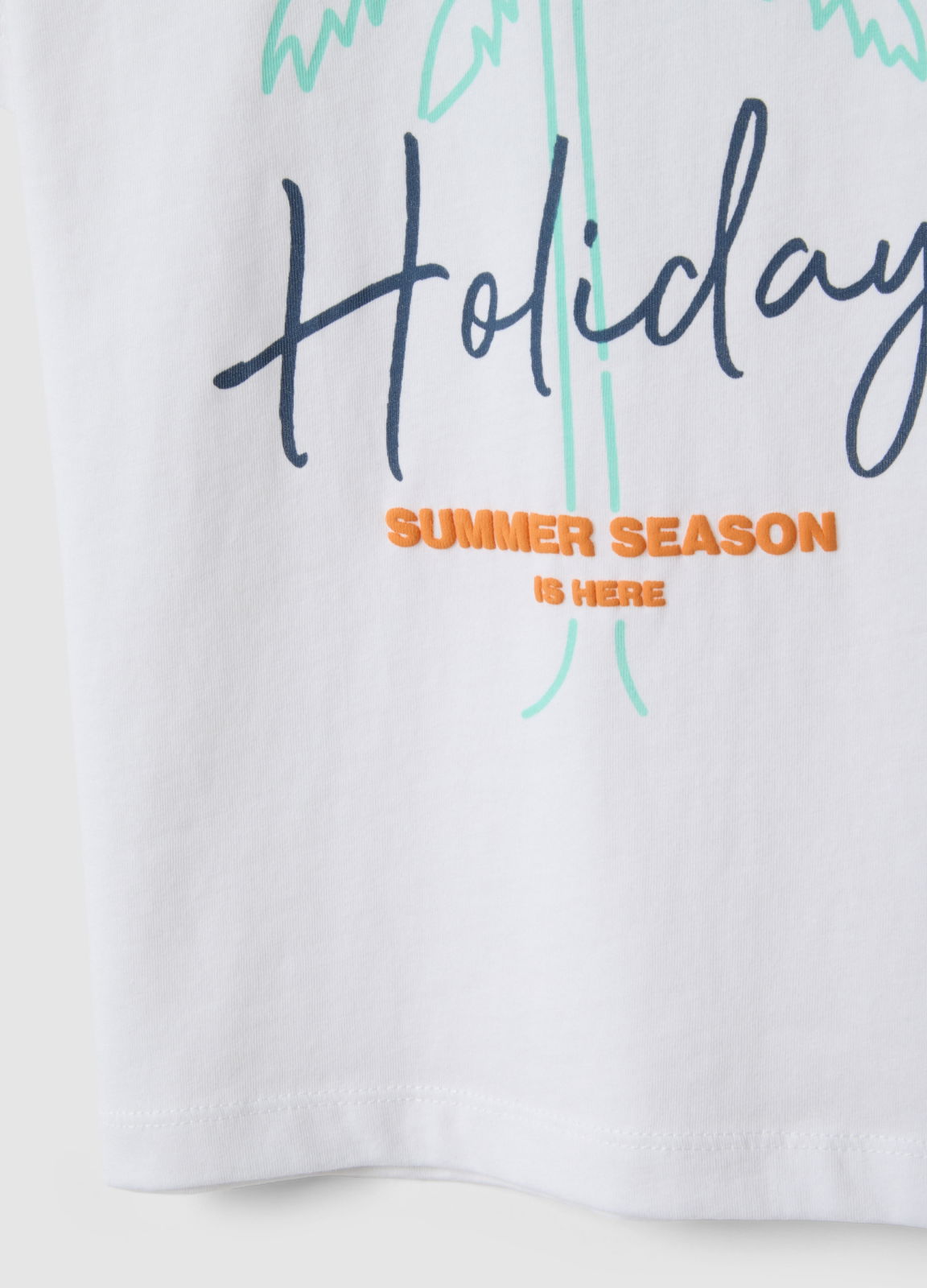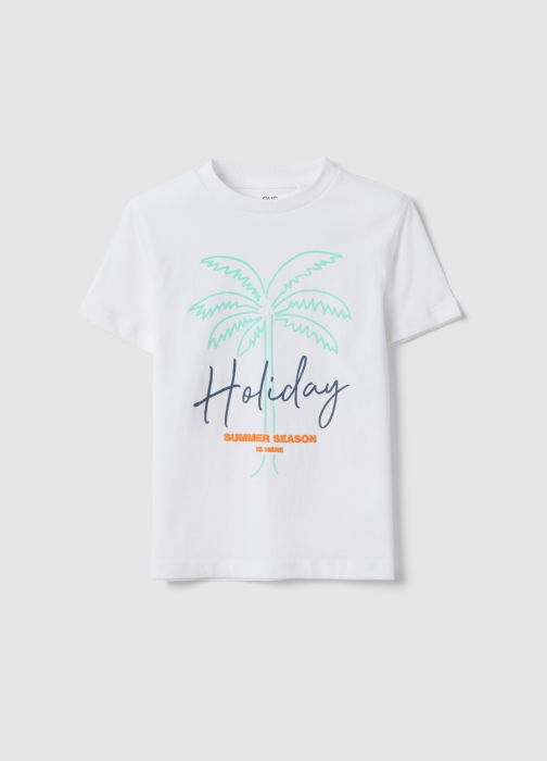Tip Produs: Tricou alb din bumbac pur pentru copii, croială regular, cu imprimeu palmieri