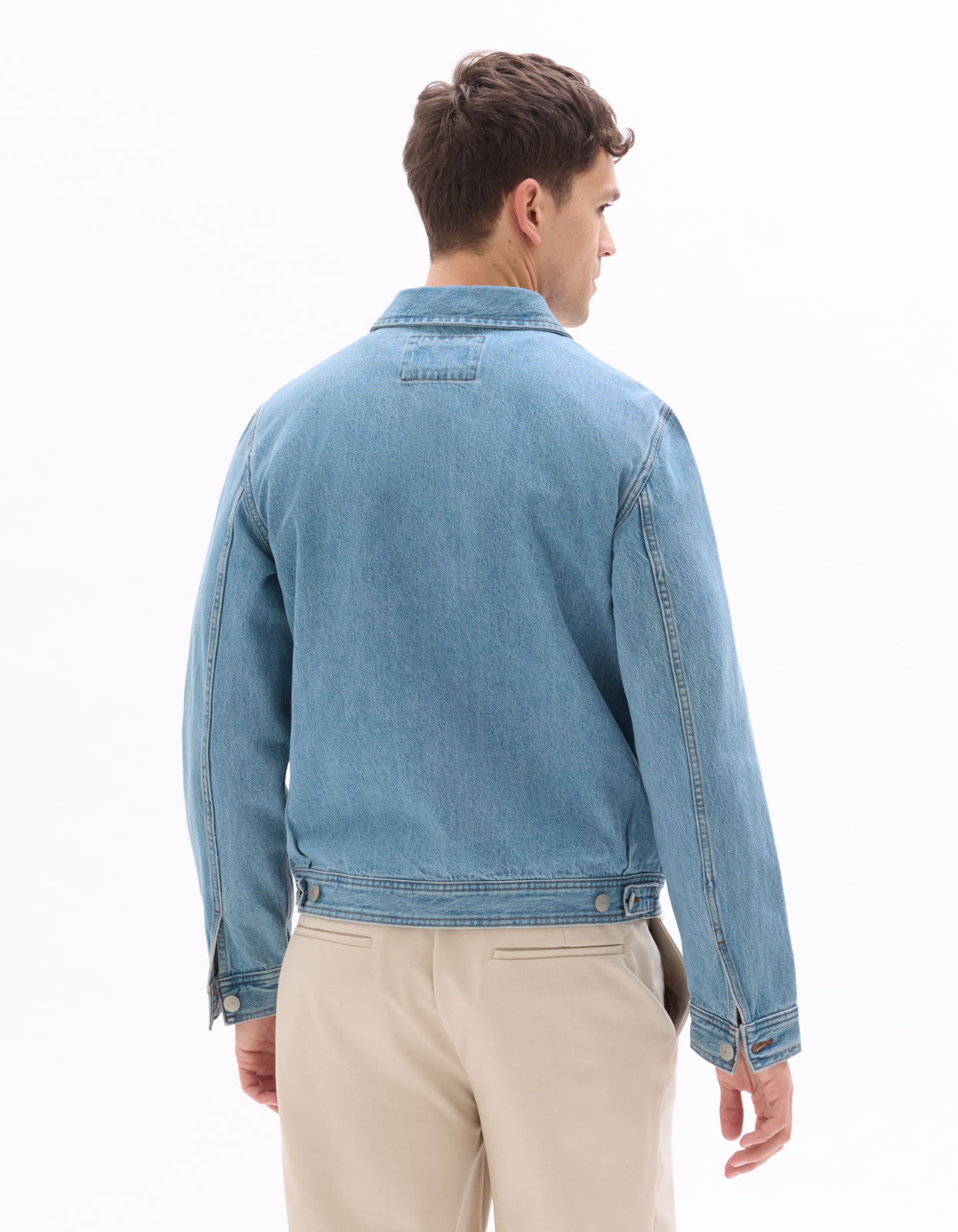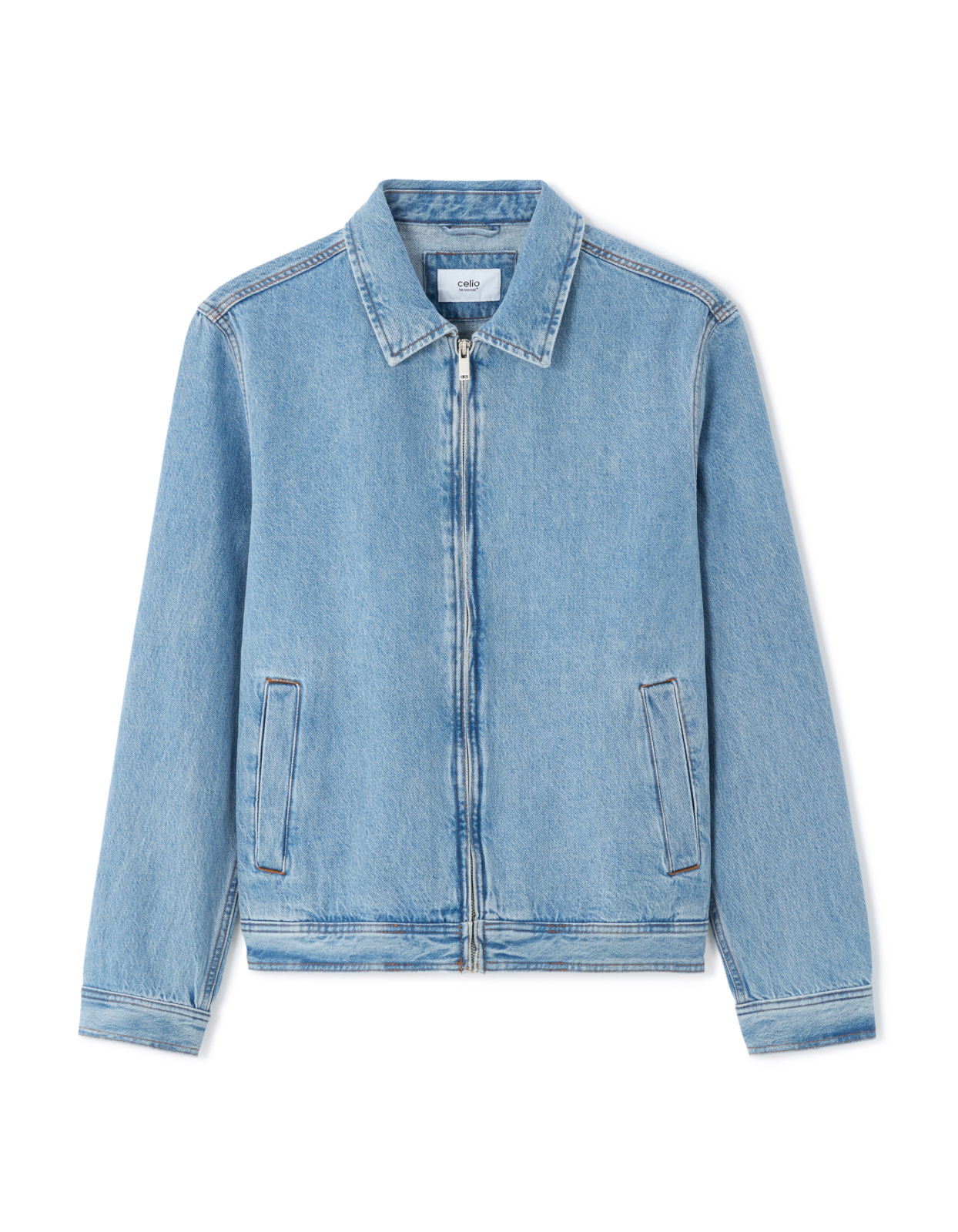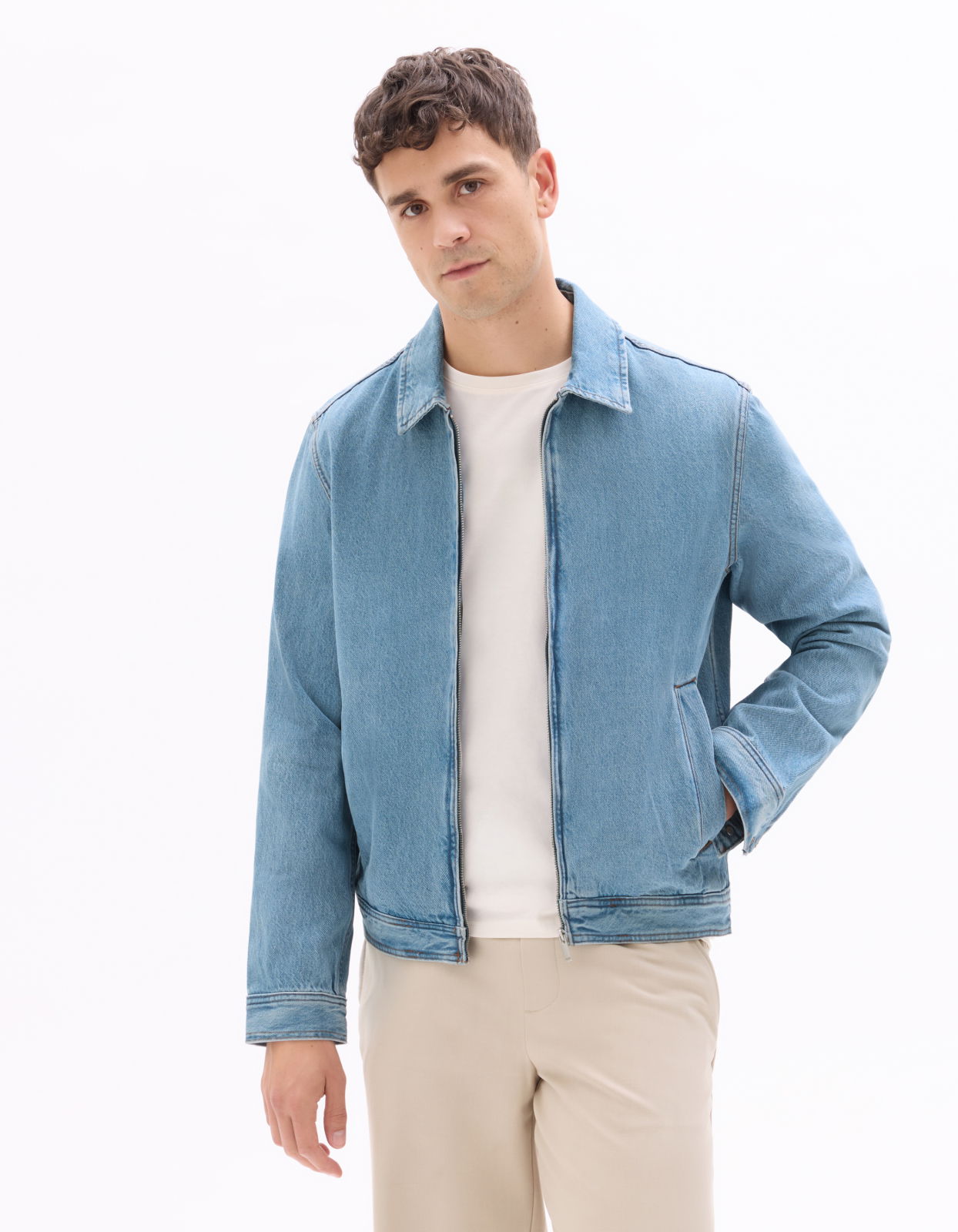 Afirmati-va identitatea cu aceasta piesa esentiala din garderoba barbateasca. - Jacheta albastra de blugi - Guler camasa - Deschidere cu fermoar in fata - Buzunare laterale - 100% bumbac - Ideal pentru asortarea cu un tricou imprimat si pantaloni chino.