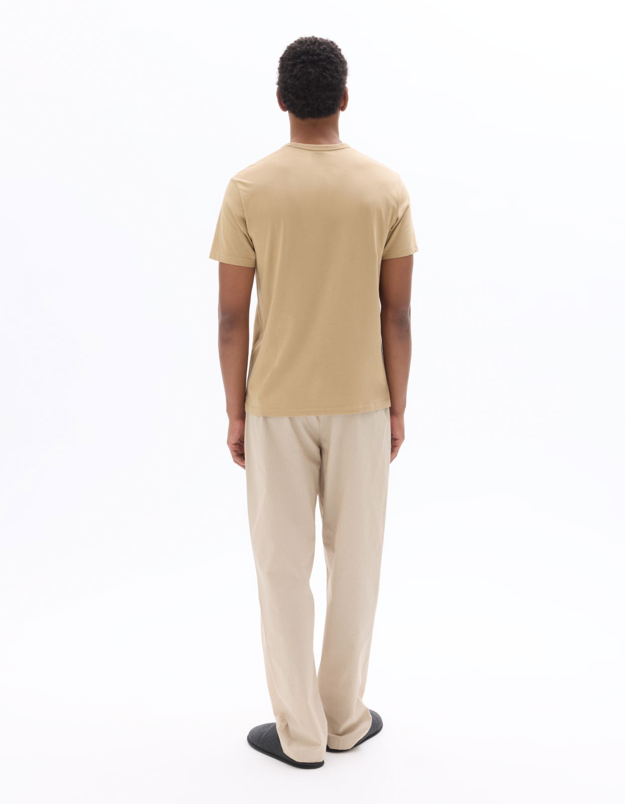 - Partea de sus: Tricou uni bej cu gat rotund, croiala lejera