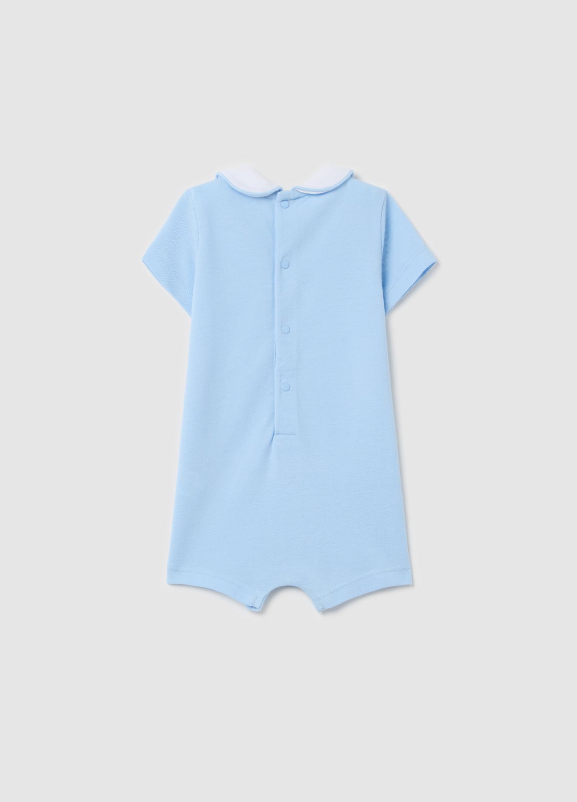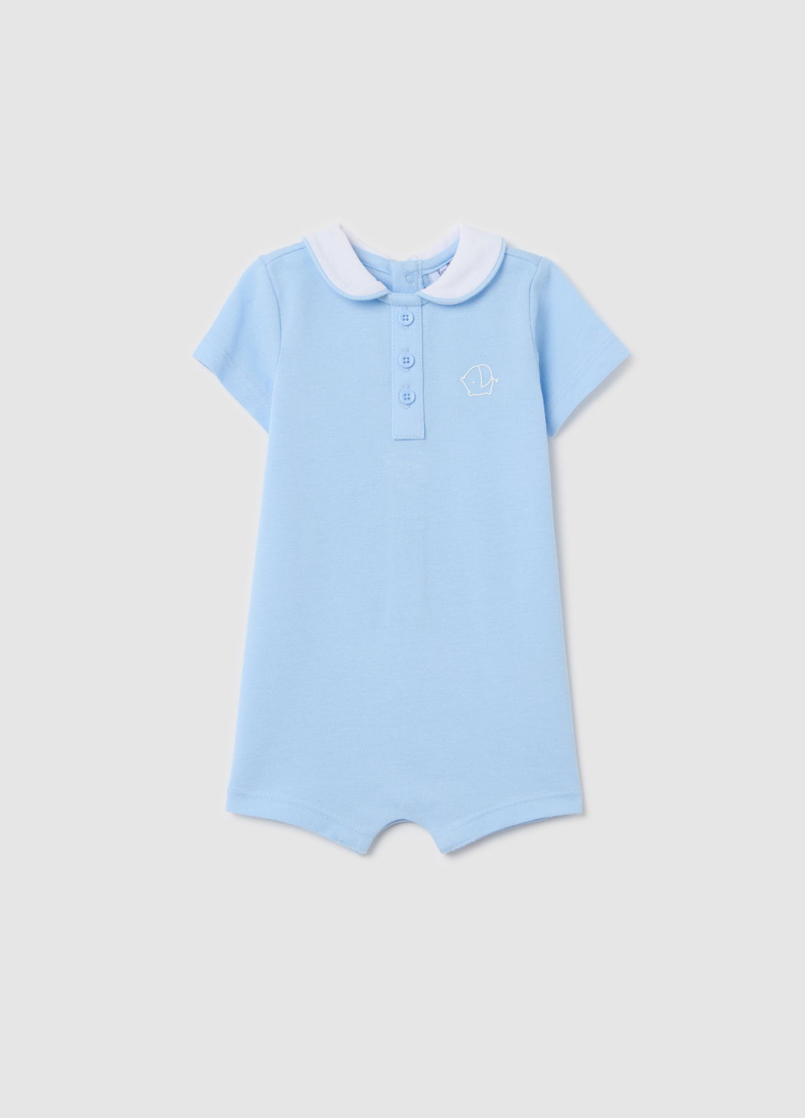 Caracteristici: Salopetă din piqué 100% bumbac. Guler rotunjit în contrast cu nasturi decorativi în față. Imprimeu cu elefant pe lateral. Închidere cu capse la spate și în zona scutecului.