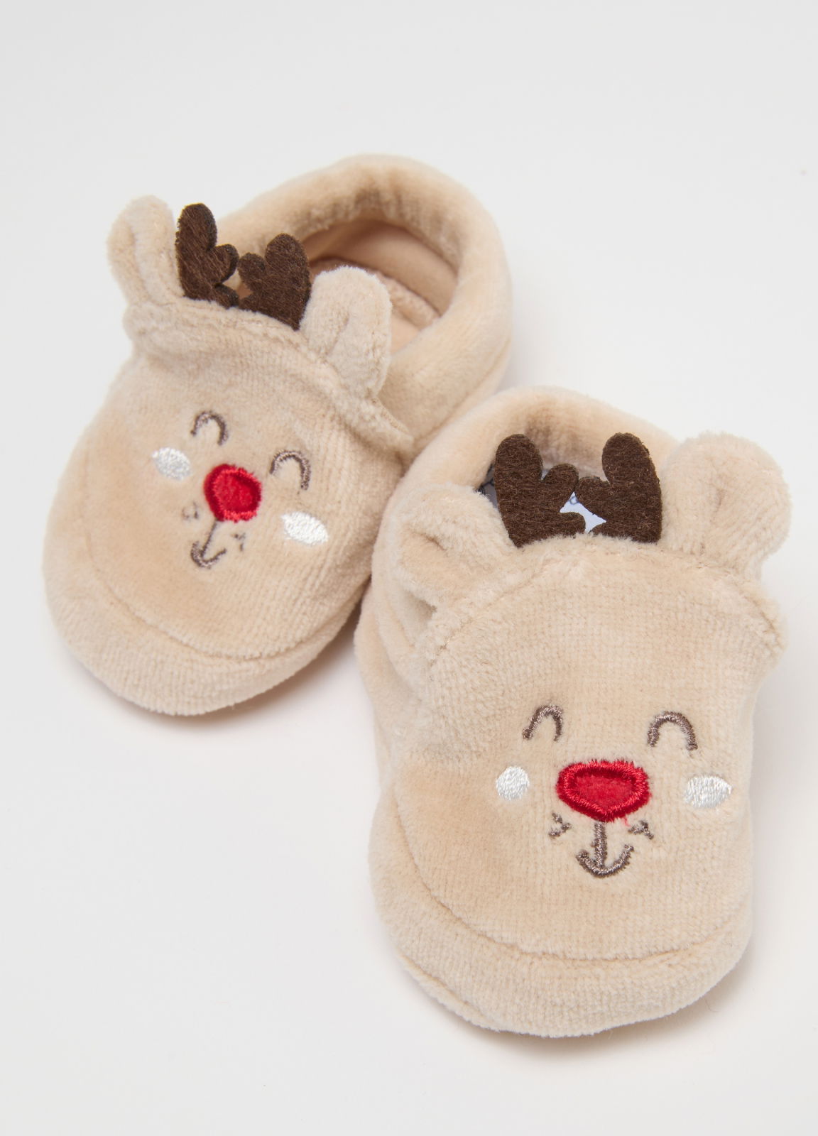 Caracteristici: Setul de Crăciun din velur bej din linia Fagottino include o căciulă și botoșei perfecți pentru a menține copilul cald. Designul vesel, cu detalii precum urechi și nas roșu, adaugă un plus de dulceață.