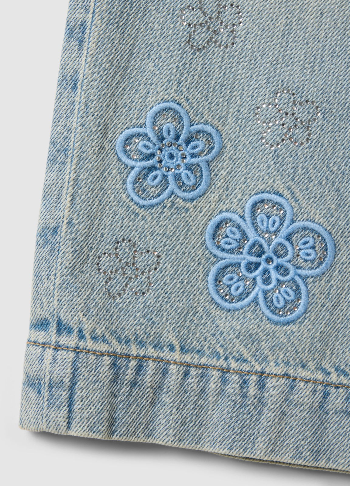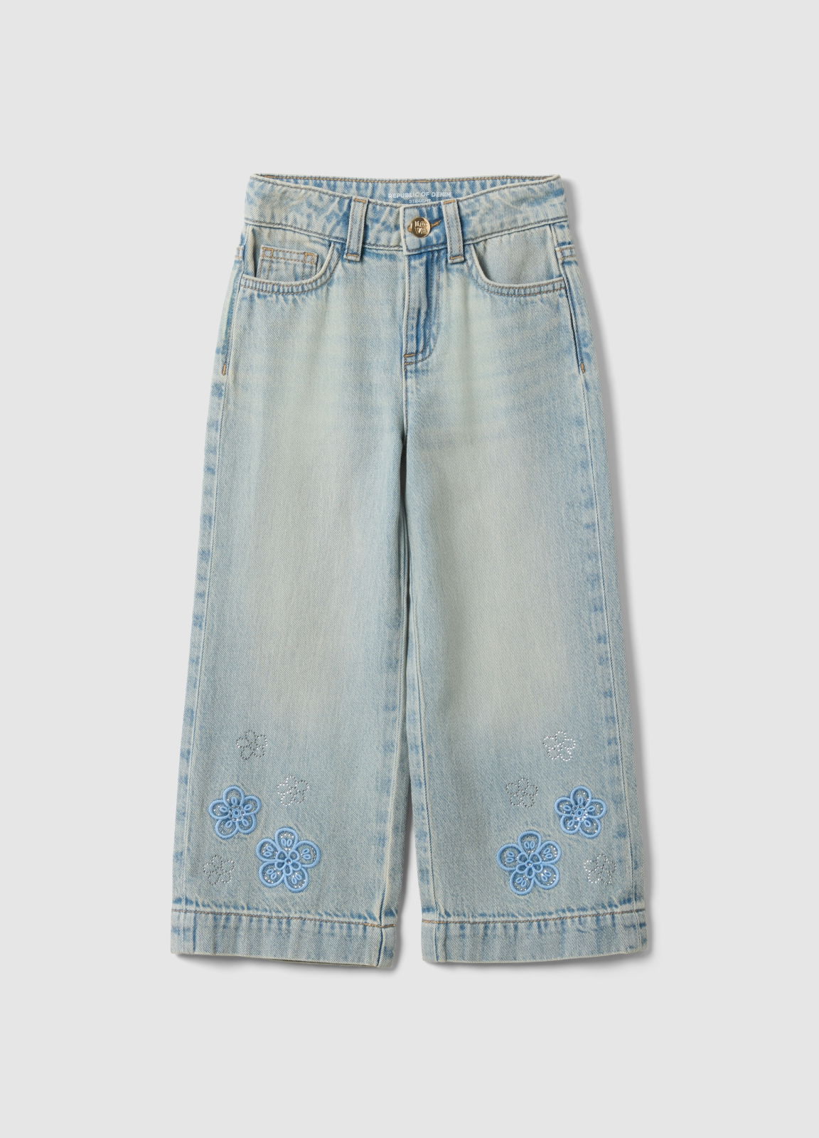 Tip Produs: Blugi fete din bumbac denim albastru deschis, croială normală, cu broderie