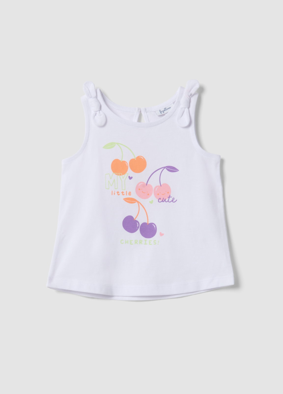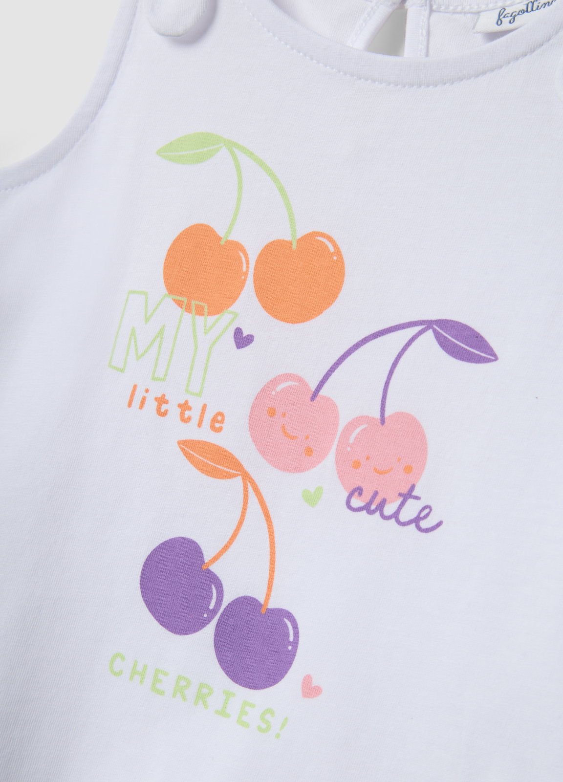 Caracteristici: Maioul alb din bumbac 100% din colecția Fagottino este ideal pentru fete cu vârste între 9 și 36 de luni, perfect pentru zilele de vară. Designul vesel cu imprimeu de cireșe colorate adaugă prospețime. Bretelele decorate cu fundițe oferă un aspect dulce și jucăuș, iar închiderea la spate facilitează îmbrăcarea. Oferă confort și prospețime pe tot parcursul zilei.