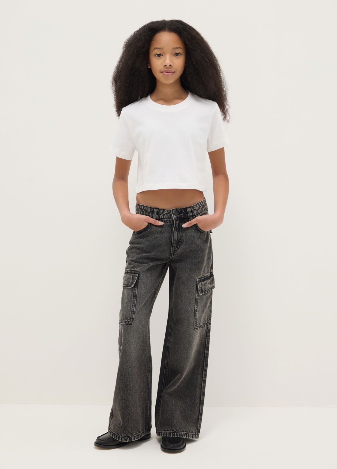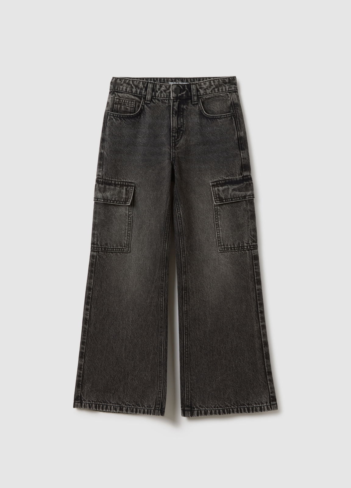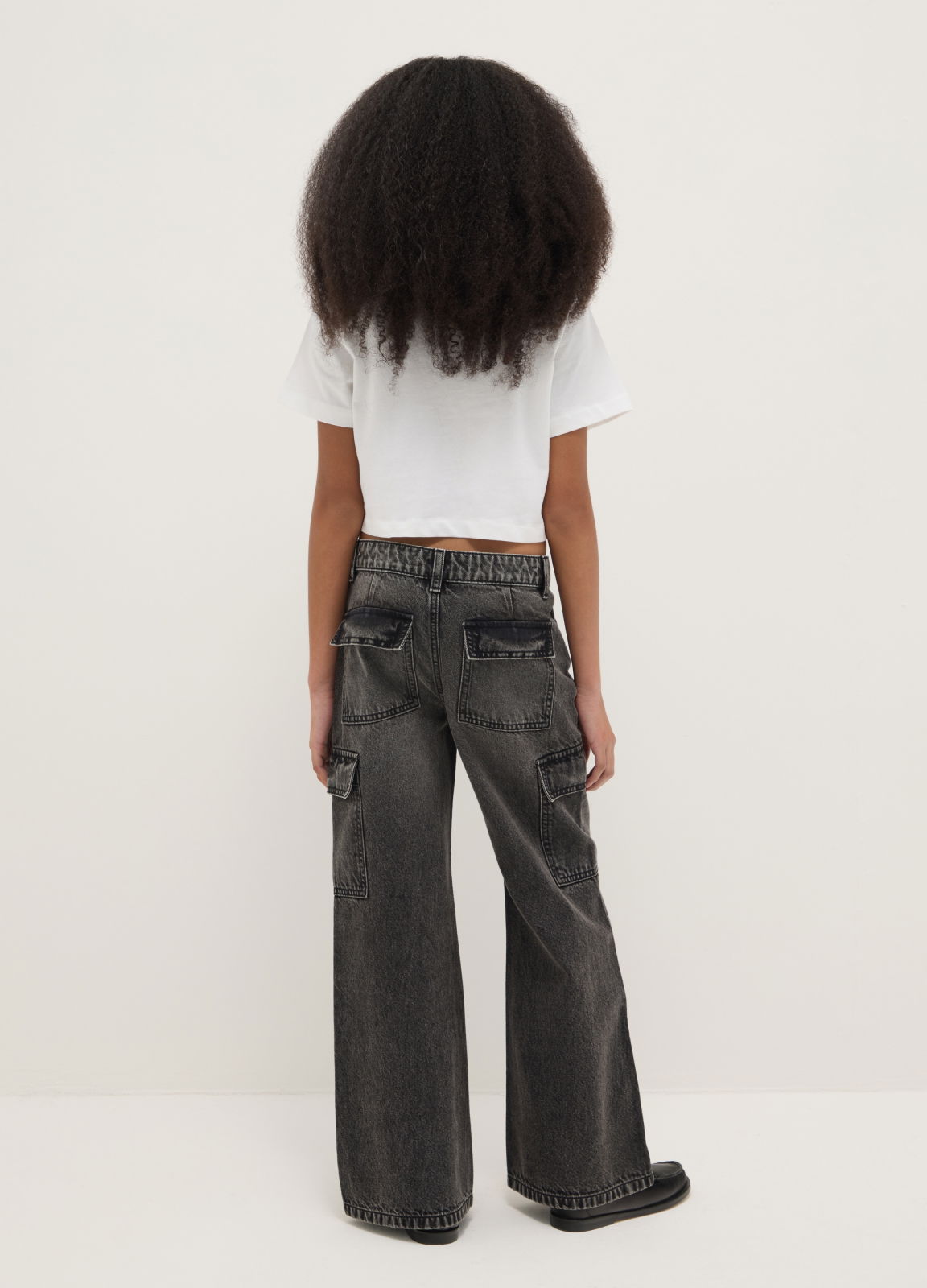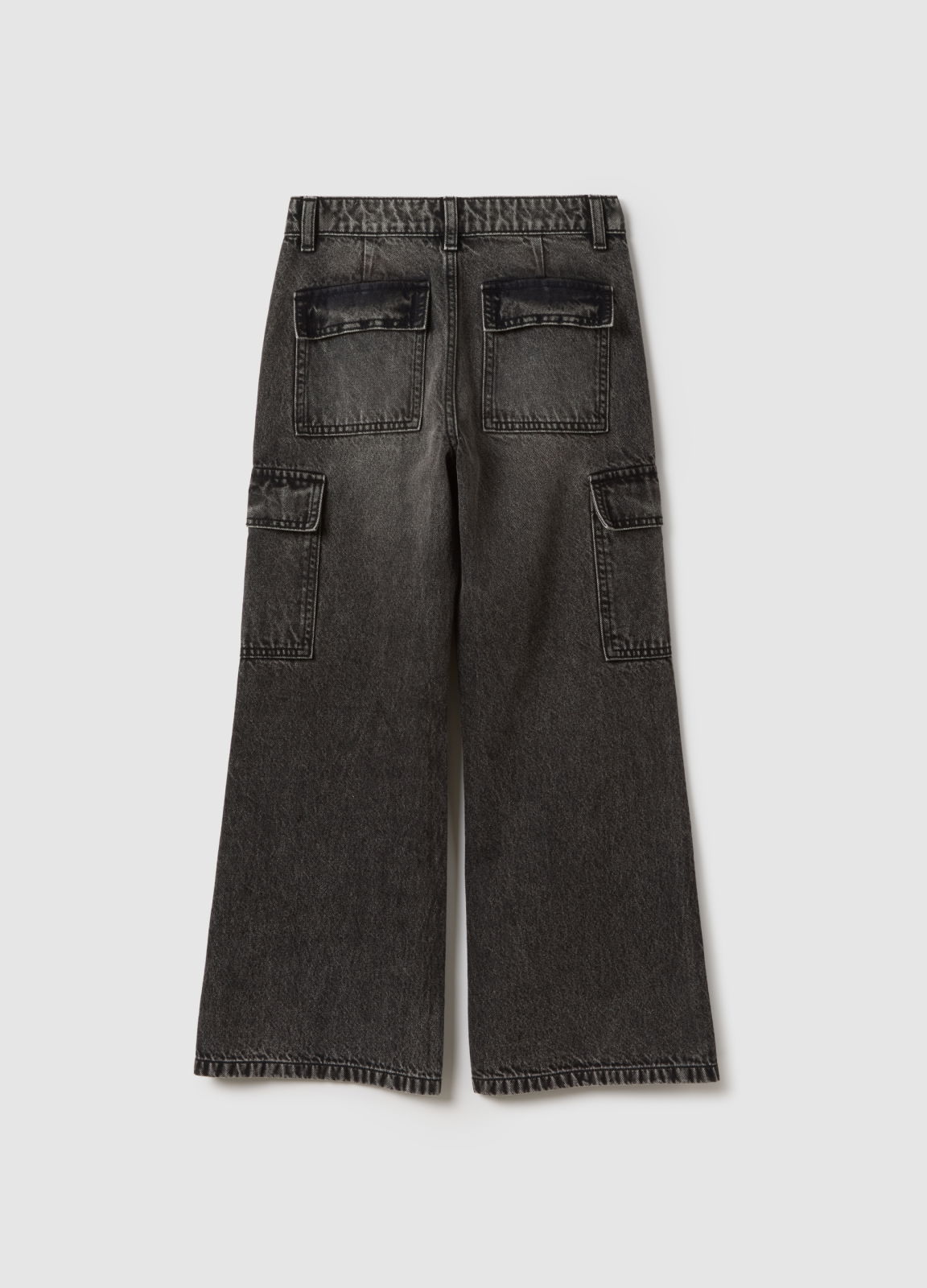Tip Produs: Blugi gri pentru fete din bumbac, cu buzunare cargo, croială lejeră
