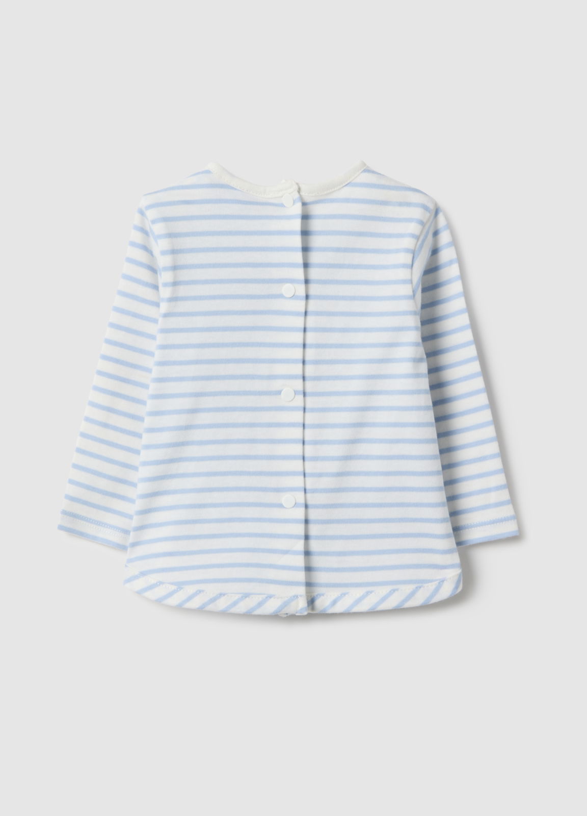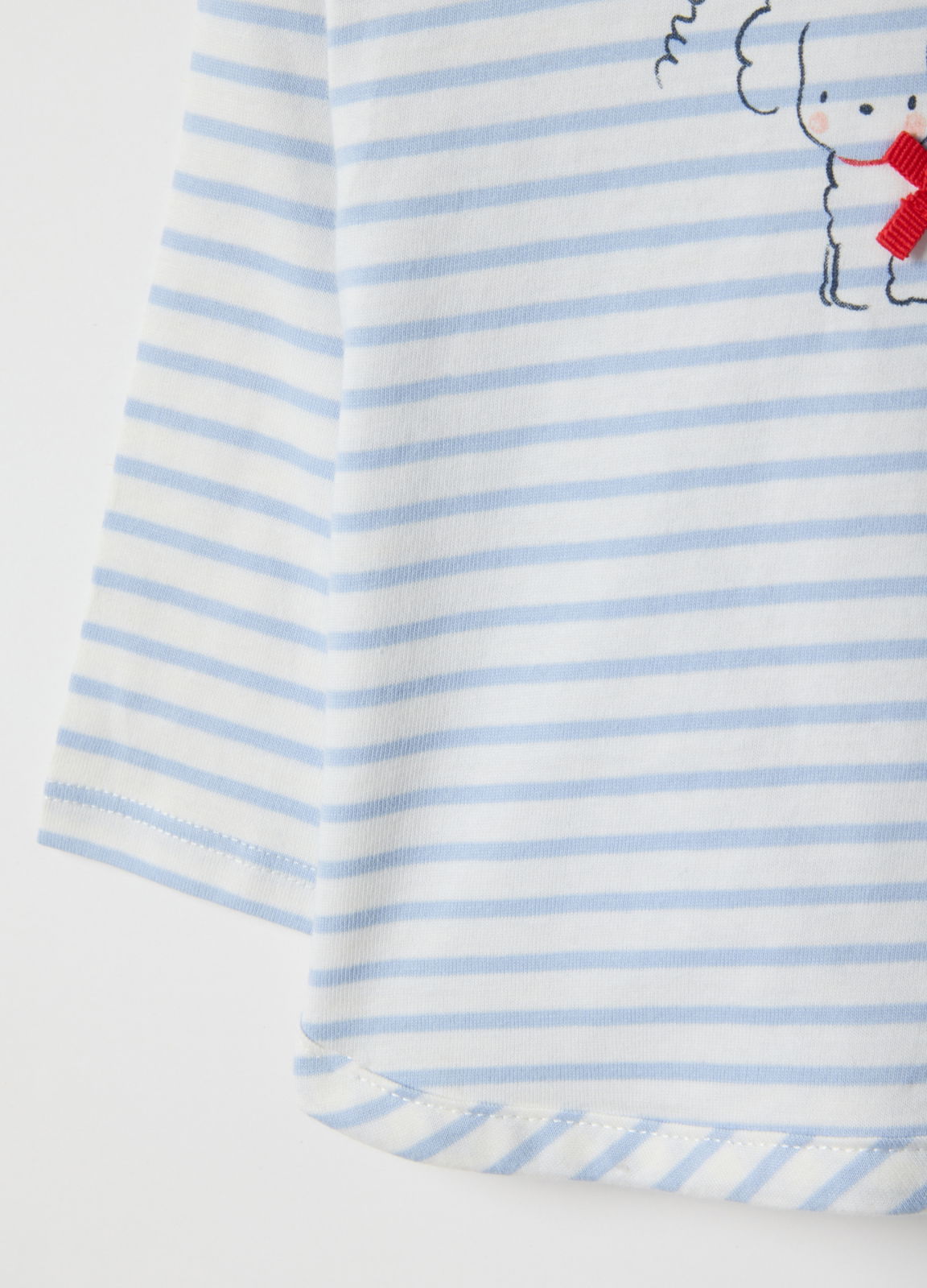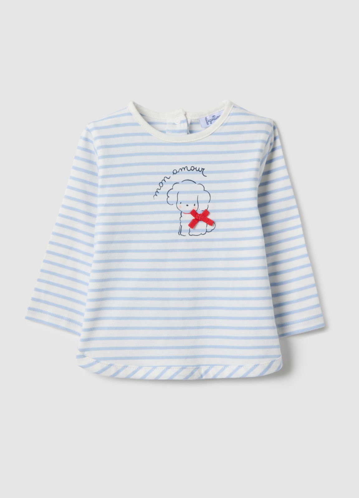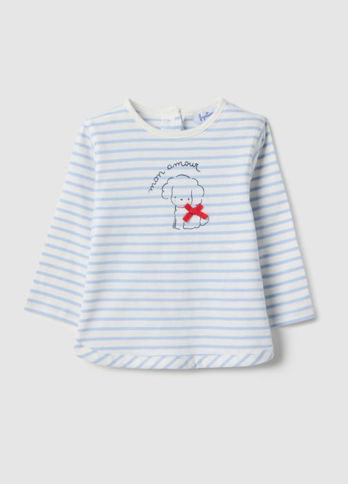 Caracteristici: Pulover cu dungi multicolor din linia Fagottino, bumbac 100%, pentru fetițe. Guler rotund, nasturi la spate, mâneci lungi, detaliu cățeluș cu fundă roșie, confortabil pentru zile răcoroase.