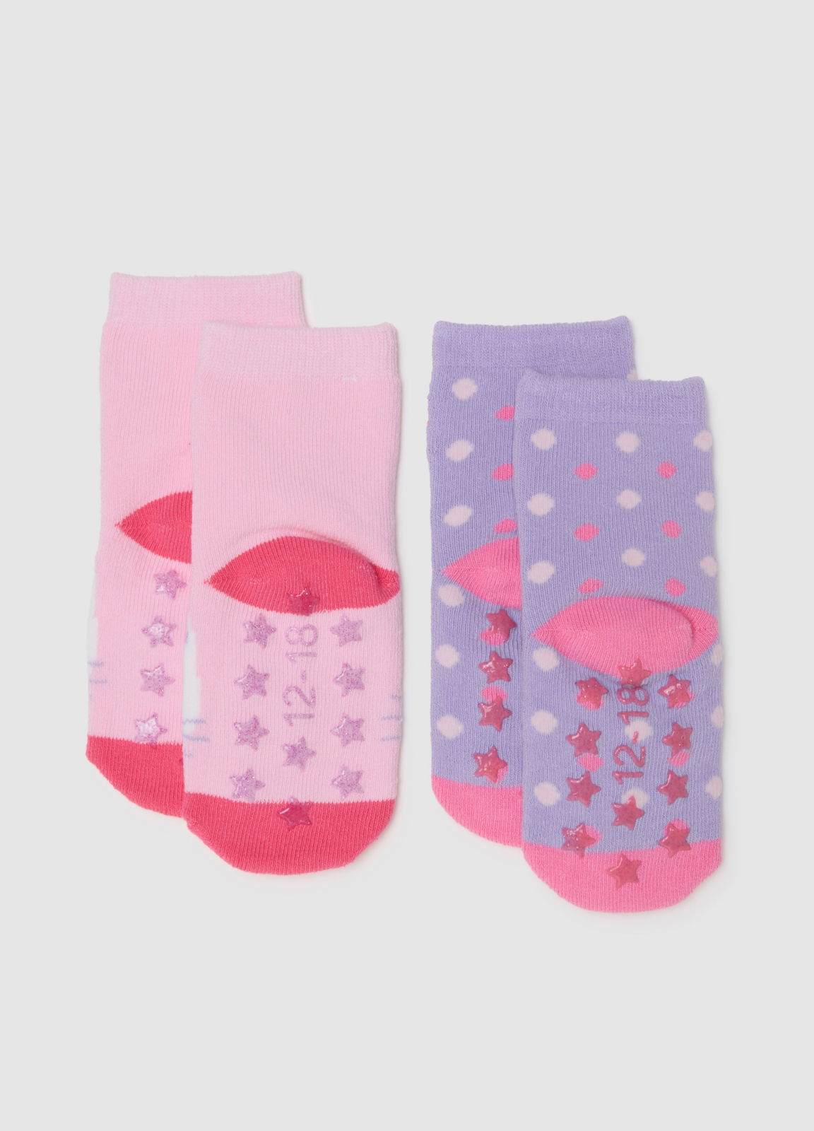 Caracteristici: Acest set bipack de șosete multicolore din bumbac pentru fete cu vârsta între 3 și 10 ani din linia Fagottino include două perechi de șosete colorate, perfecte pentru a adăuga un strop de veselie picioarelor lor. O pereche prezintă un motivațiu drăguț cu o pisică și stele roz pe un fundal deschis, iar cealaltă este decorată cu puncte albe și roz pe un fundal mov. Ideal pentru a păstra picioarele calde toată ziua.