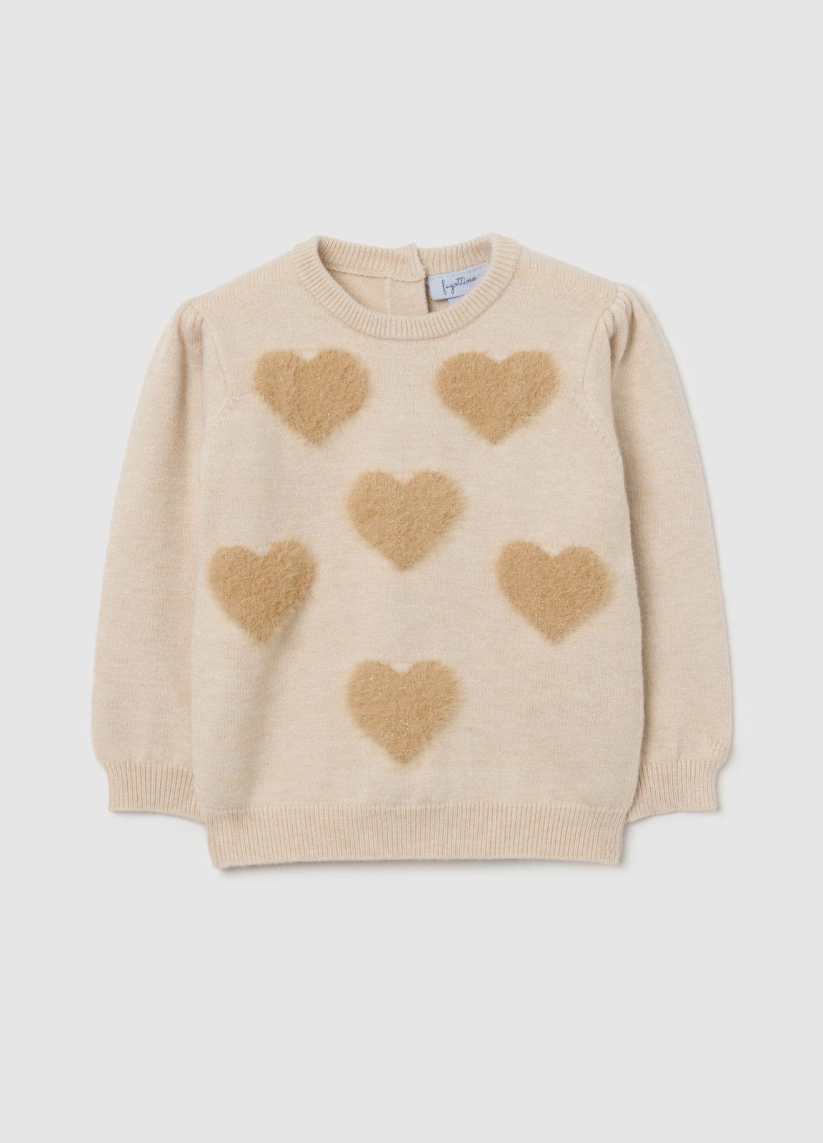 Caracteristici: Pulover bej pentru fete, realizat dintr-un amestec de viscoză, poliester și poliamidă. Decorat cu inimioare tricotate jacquard, oferă confort și finețe datorită texturii moi. Gulerul rotund și închiderea cu nasture la spate facilitează îmbrăcarea. Ideal pentru a-ți menține micuța caldă în lunile reci, potrivit pentru fete între 9 și 36 de luni.