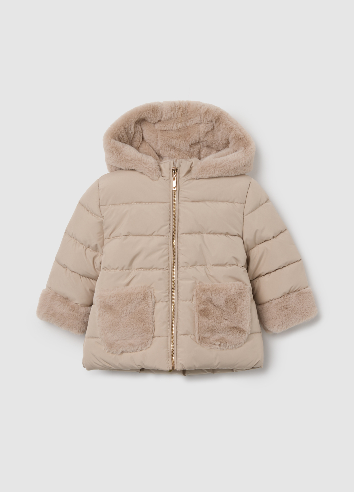 Tip Produs: Geacă bej matlasată cu glugă din blană ecologică