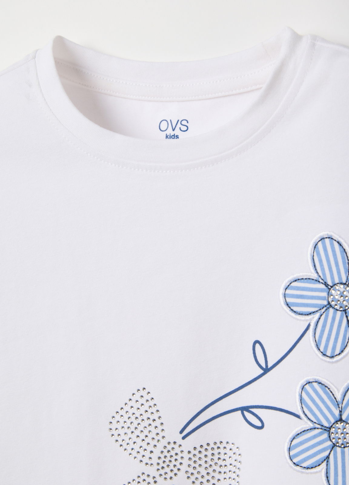 Caracteristici: Tricou alb din linia OVS KIDS, bumbac elastic, pentru fete între 3 și 10 ani. Croială normală, imprimeu floral cu pietricele, guler rotund și mânecă scurtă, confortabil pentru joacă.