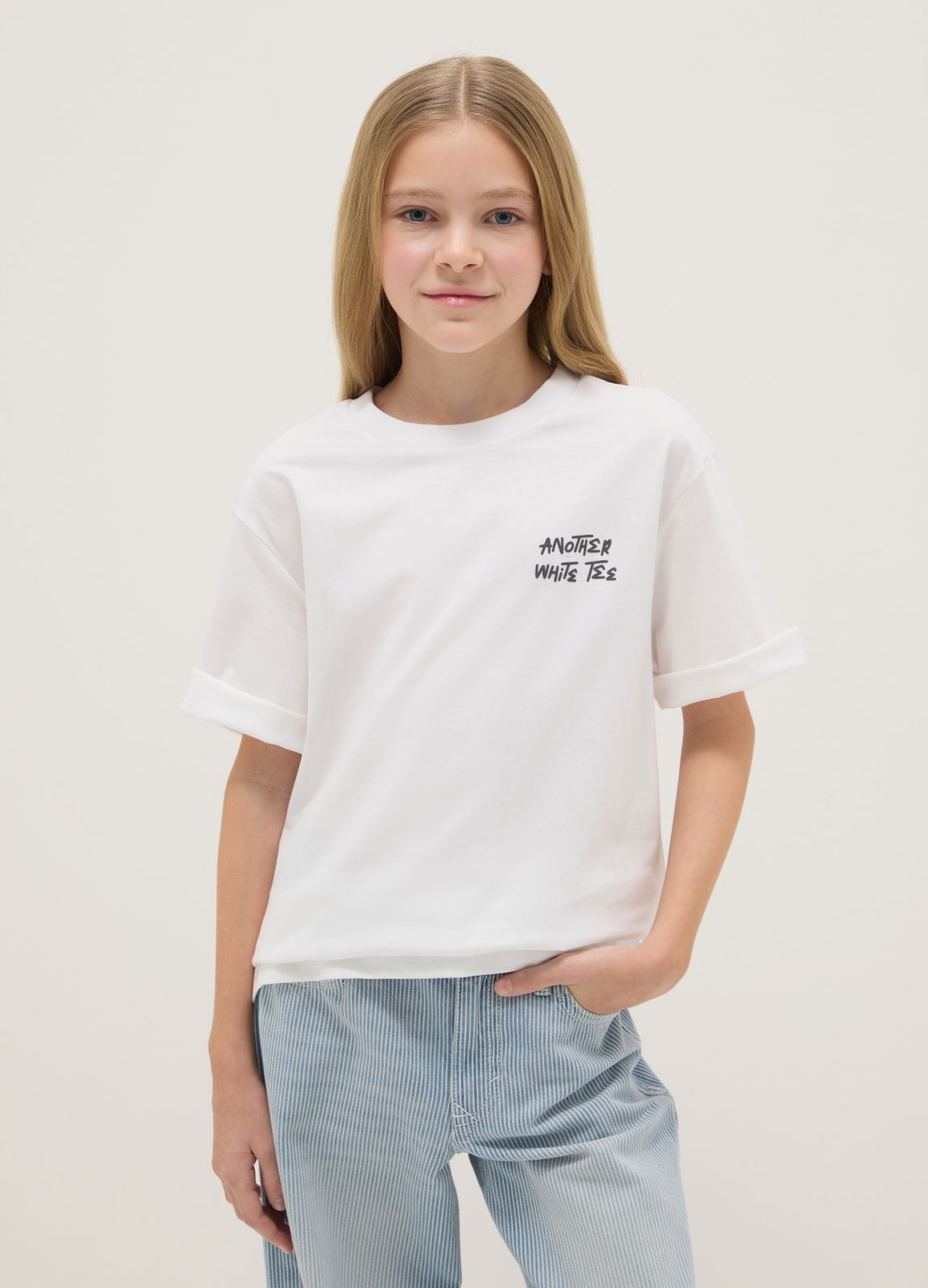 Tip Produs: Tricou alb pentru fete, din bumbac 100%, croială overfit, cu inscripție