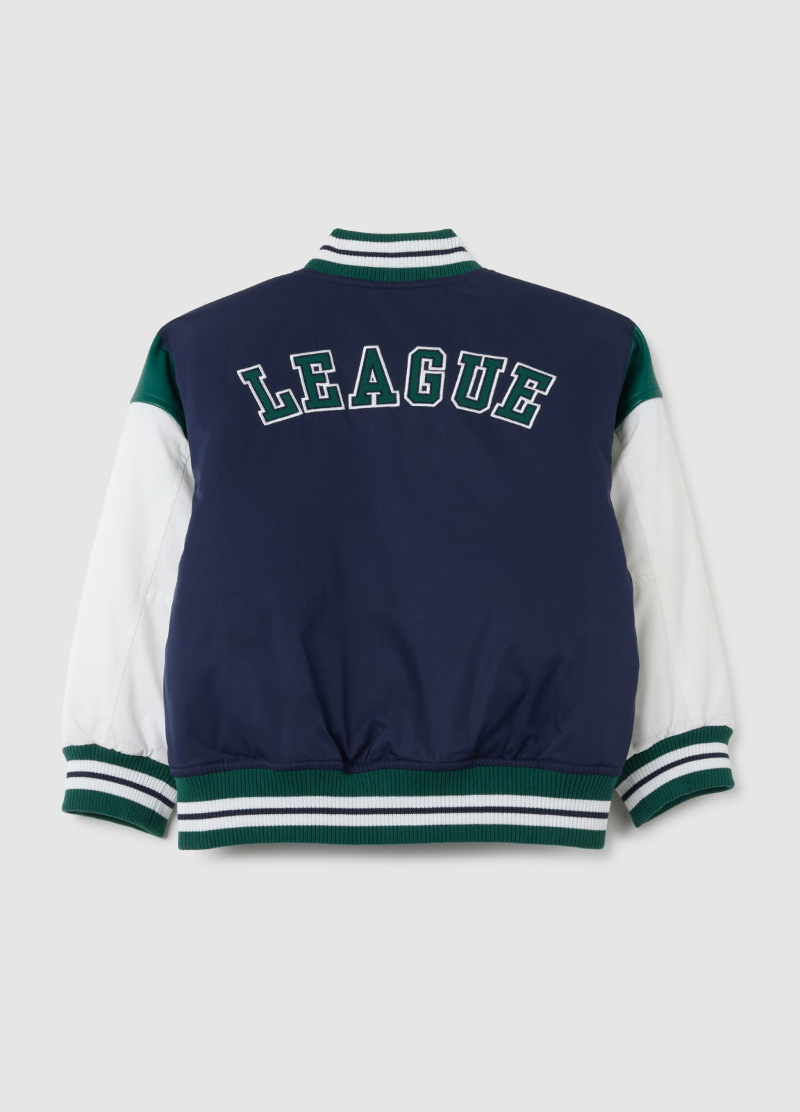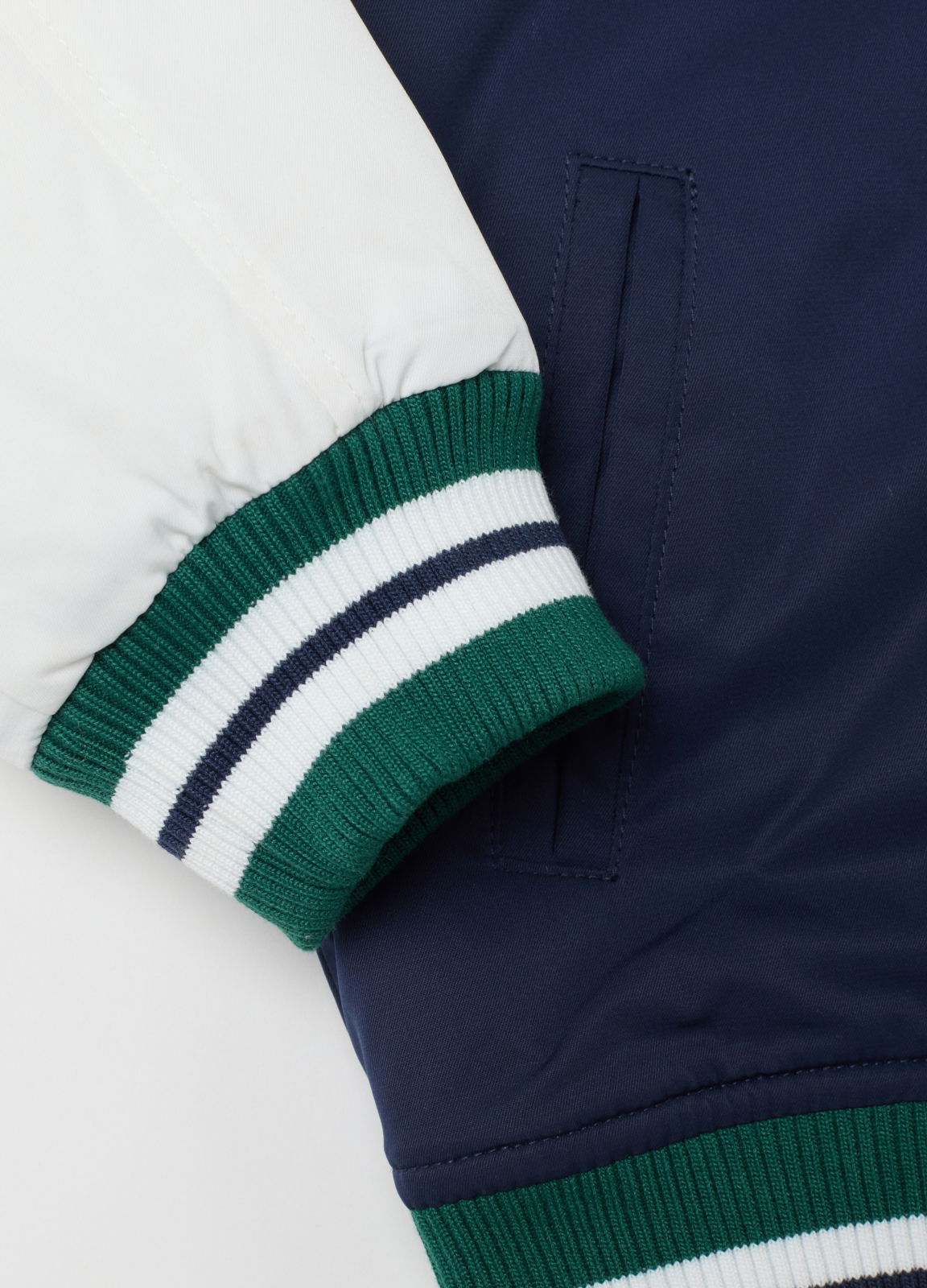Caracteristici: Jacheta de tip varsity din linia OVS Kids este destinată copiilor cu vârsta între 3 și 10 ani. Având corpul albastru și mânecile albe, este perfectă pentru a adăuga un accent sportiv și casual ținutei. Accentele de riburi verzi îmbunătățesc designul dinamic, iar aplicația 'W' de pe față oferă un detaliu distinctiv. Închiderea cu capse asigură atât practicitate, cât și stil. Mai mult, materialul este rezistent la apă, făcându-l o piesă versatilă ideală pentru orice ocazie casuală.