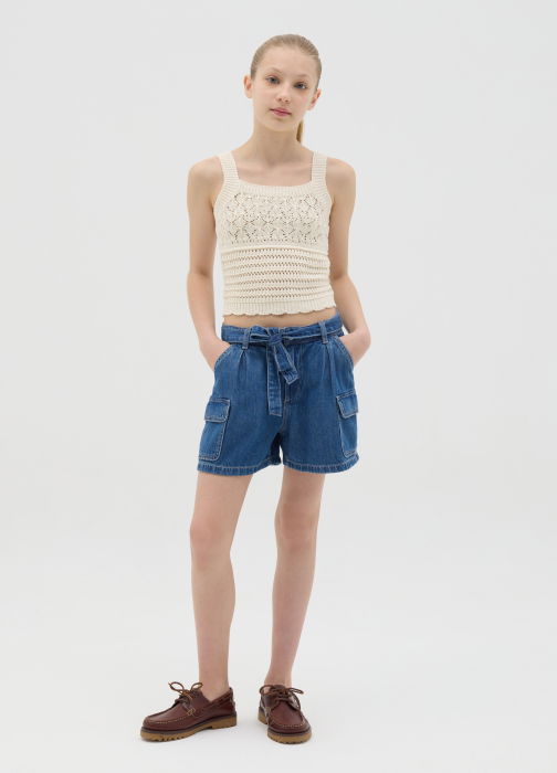 Caracteristici: Pantaloni scurți cargo din denim 100% bumbac. Cinci buzunare obișnuite și două buzunare cu clapetă pe laterale. Talie reglabilă cu brâu.