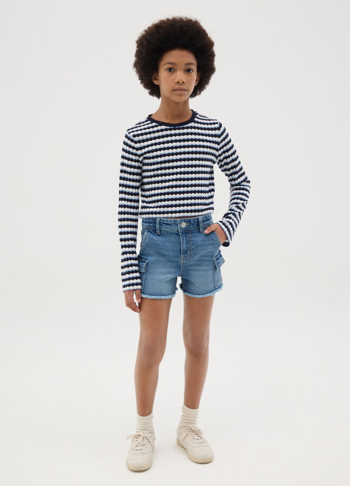 Caracteristici: Șorturi cargo din denim elastic din bumbac. Ajustare internă a taliei. Două buzunare oblice și două buzunare cu clapetă pe laterale. Tiv ciufulit. Închidere cu fermoar și nasture.