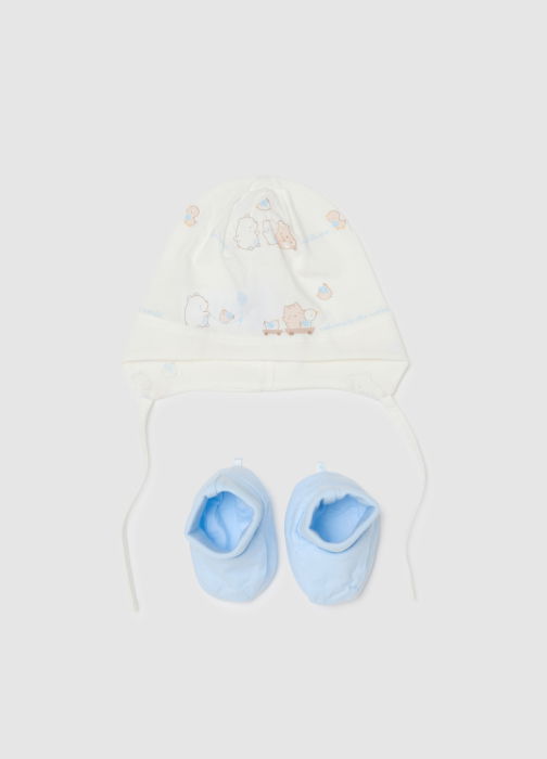Характеристики: Разноцветный комплект линии Fagottino включает белую шапочку и голубую обувь, идеально для новорожденных. Из 100% хлопка, обеспечивает комфорт и тепло в первые дни жизни. Шапочка с милыми иллюстрациями животных добавляет радости. Обувь мягко защищает ноги ребенка, идеально для первых приключений.