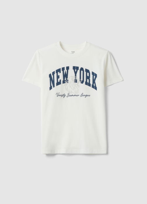 Характеристики: Белая футболка из линии OVS KIDS - универсальная вещь для повседневного образа, идеально подходящая для мальчиков от 10 до 15 лет. Изготовлена из чистого хлопка, обеспечивает комфорт и свободу движений благодаря круглому вырезу и коротким рукавам. Графический принт «New York» спереди добавляет отличительный акцент.