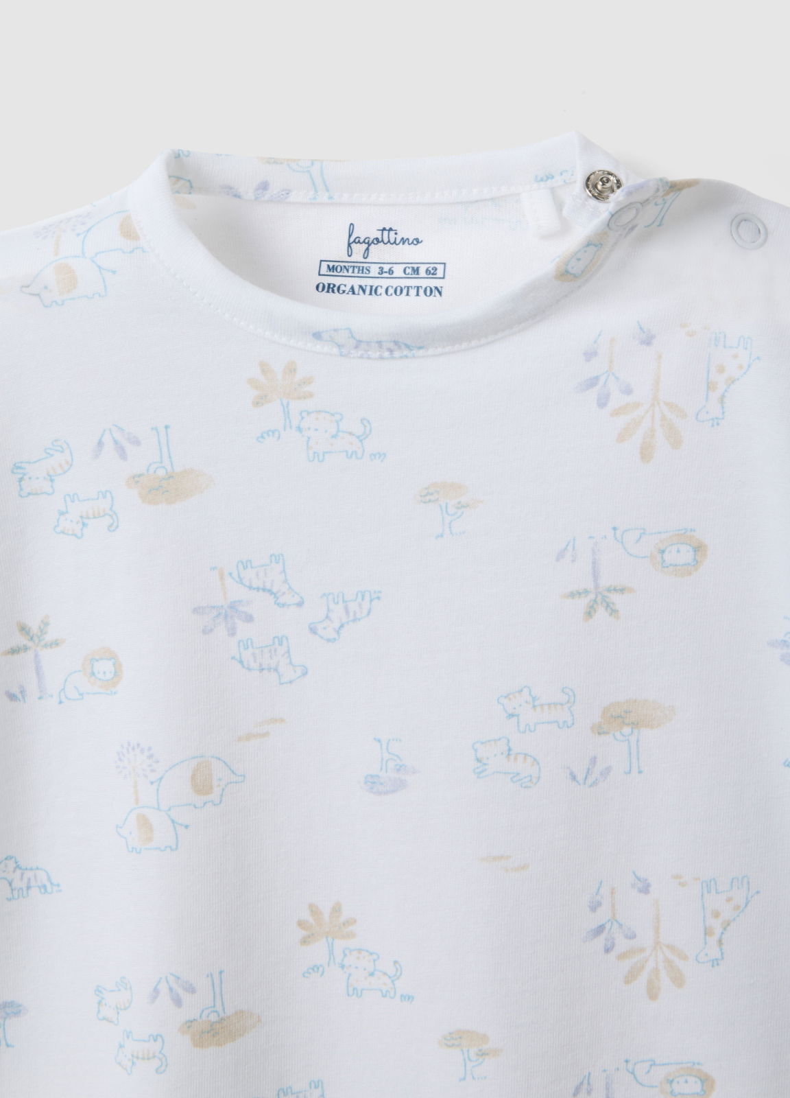 Характеристики: Комбинезон bipack Fagottino для новорожденных 0-36 месяцев, хлопок 100%, мягкий, короткий рукав, круглый вырез, застежки на кнопки, милые рисунки животных.