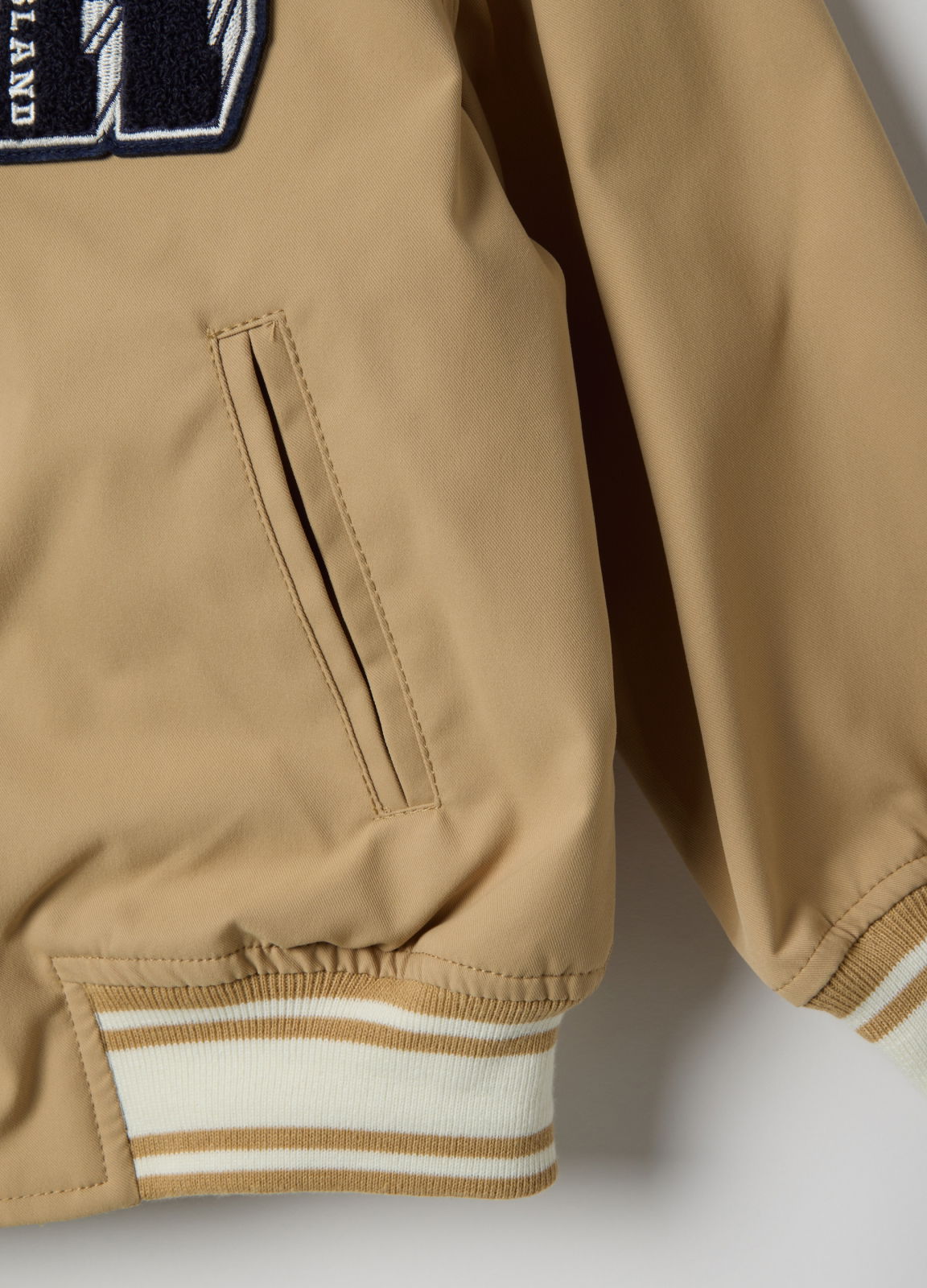Тип продукта: Бежевая детская бомбер-куртка, обычная посадка, с нашивкой