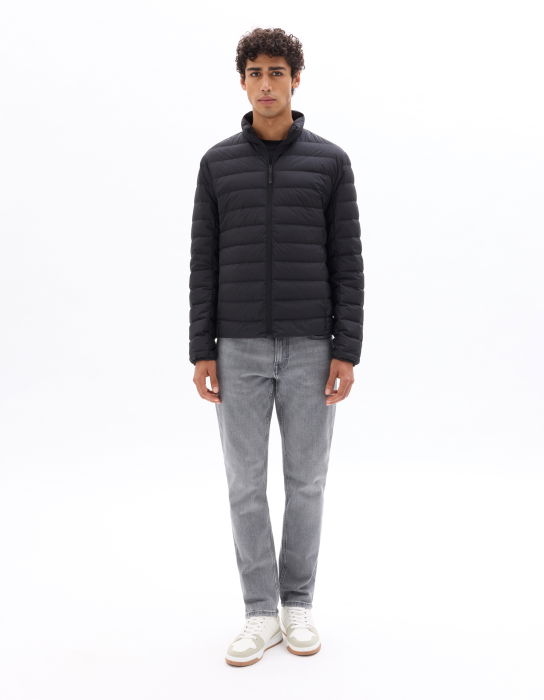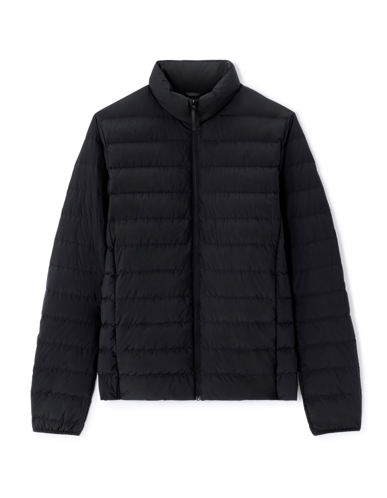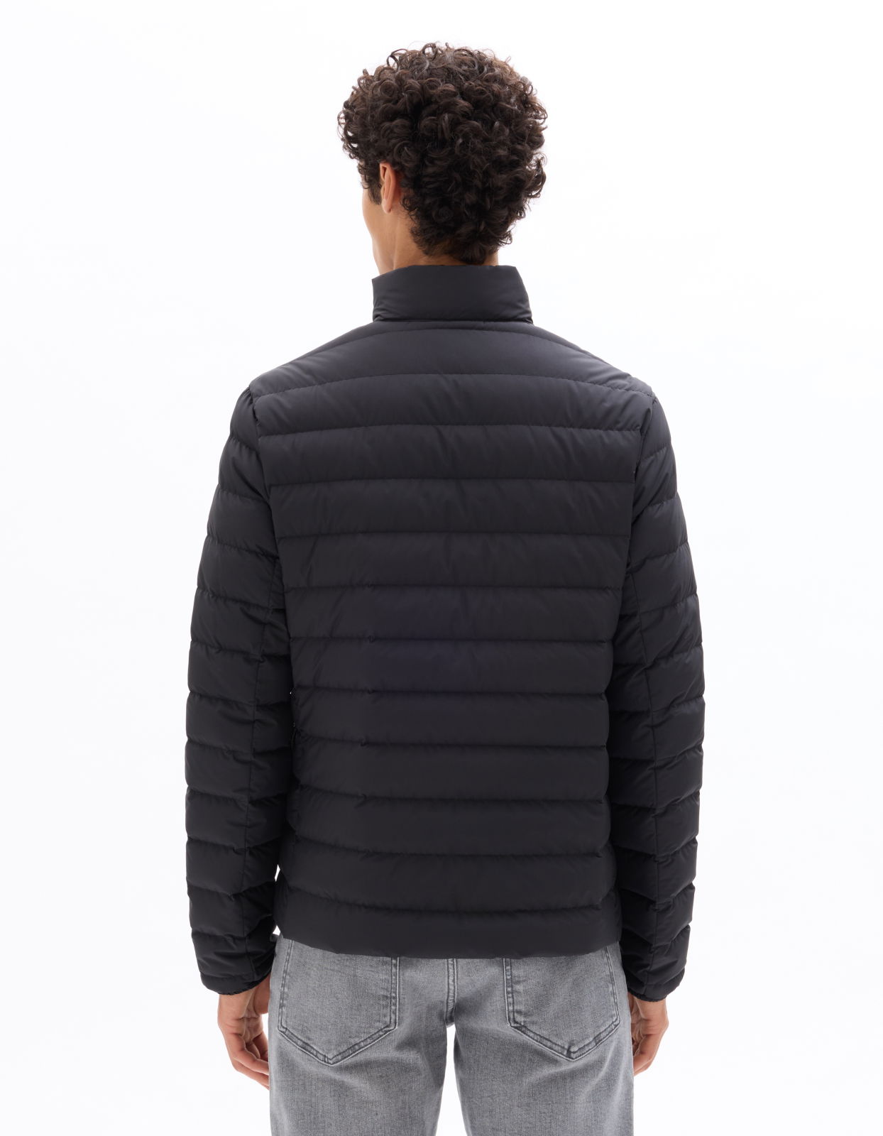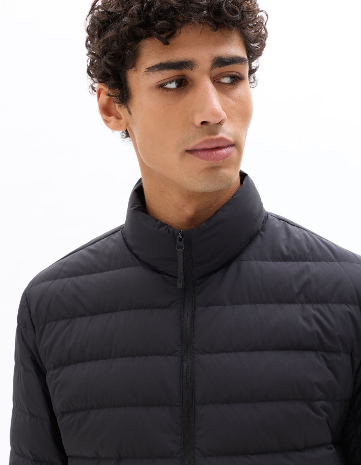 - Легкий черный пуховик с длинными рукавами и воротником-стойкой