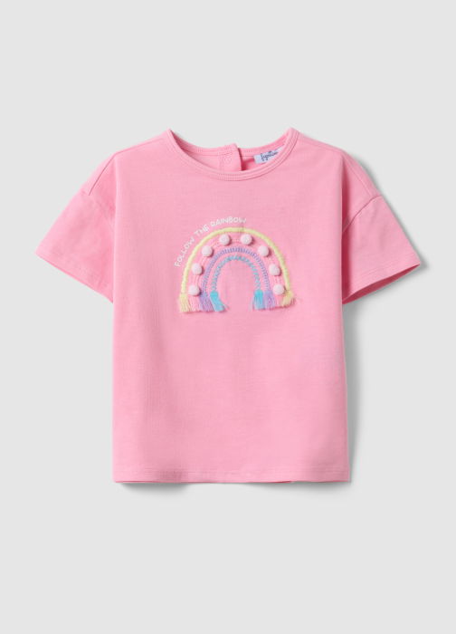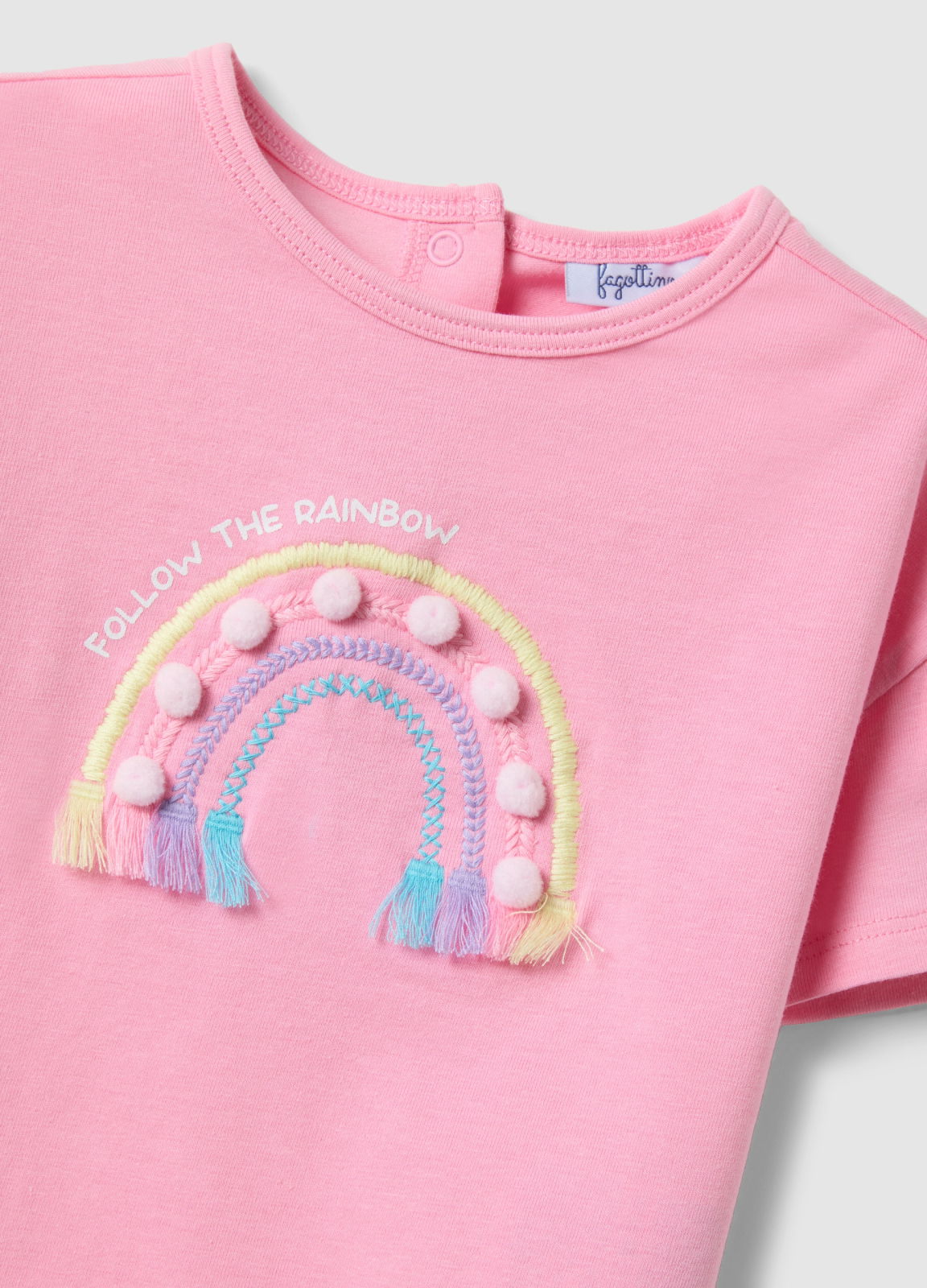 Характеристики: Розовая футболка из линии Fagottino изготовлена из эластичного хлопка, обеспечивая комфорт и мягкость летом. Предназначена для девочек от 9 до 36 месяцев, имеет посадку regular fit с короткими рукавами и очаровательной вышивкой радуги спереди. Застёжка на пуговицы сзади облегчает одевание, делая её практичной для ежедневных игр.
