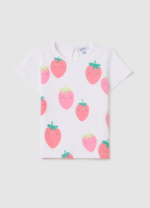 Характеристики: Футболка из 100% хлопка. Круглый воротник. Принт с клубникой на передней части. Разрез с застежкой на спине.