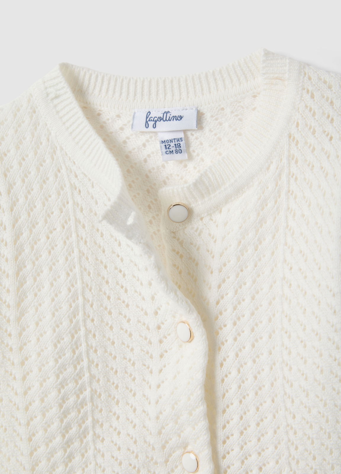 Характеристики: Белый кардиган из линии Fagottino идеально подходит для девочек от 9 до 36 месяцев в межсезонье. Изготовлен из чистого хлопка и имеет приталенный силуэт благодаря кружевному трикотажному дизайну. Передние пуговицы облегчают одевание, а круглый вырез и длинные рукава обеспечивают комфорт. Практичная и универсальная вещь для любого случая.