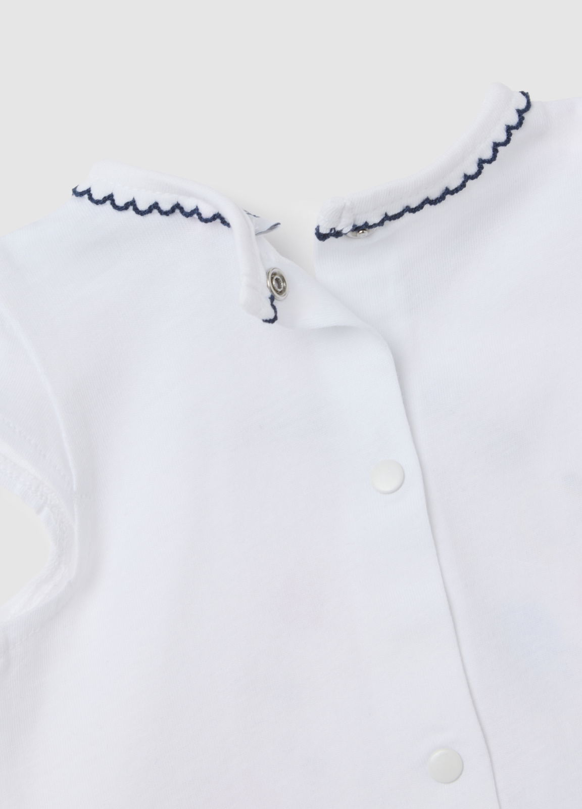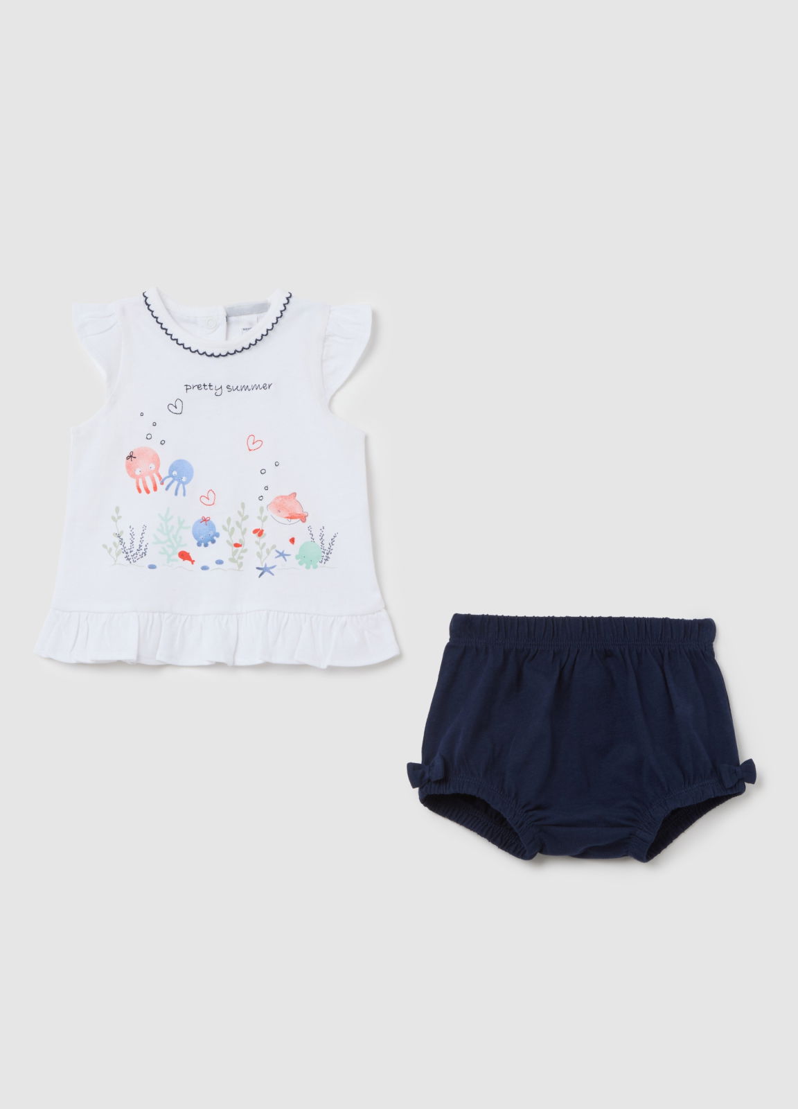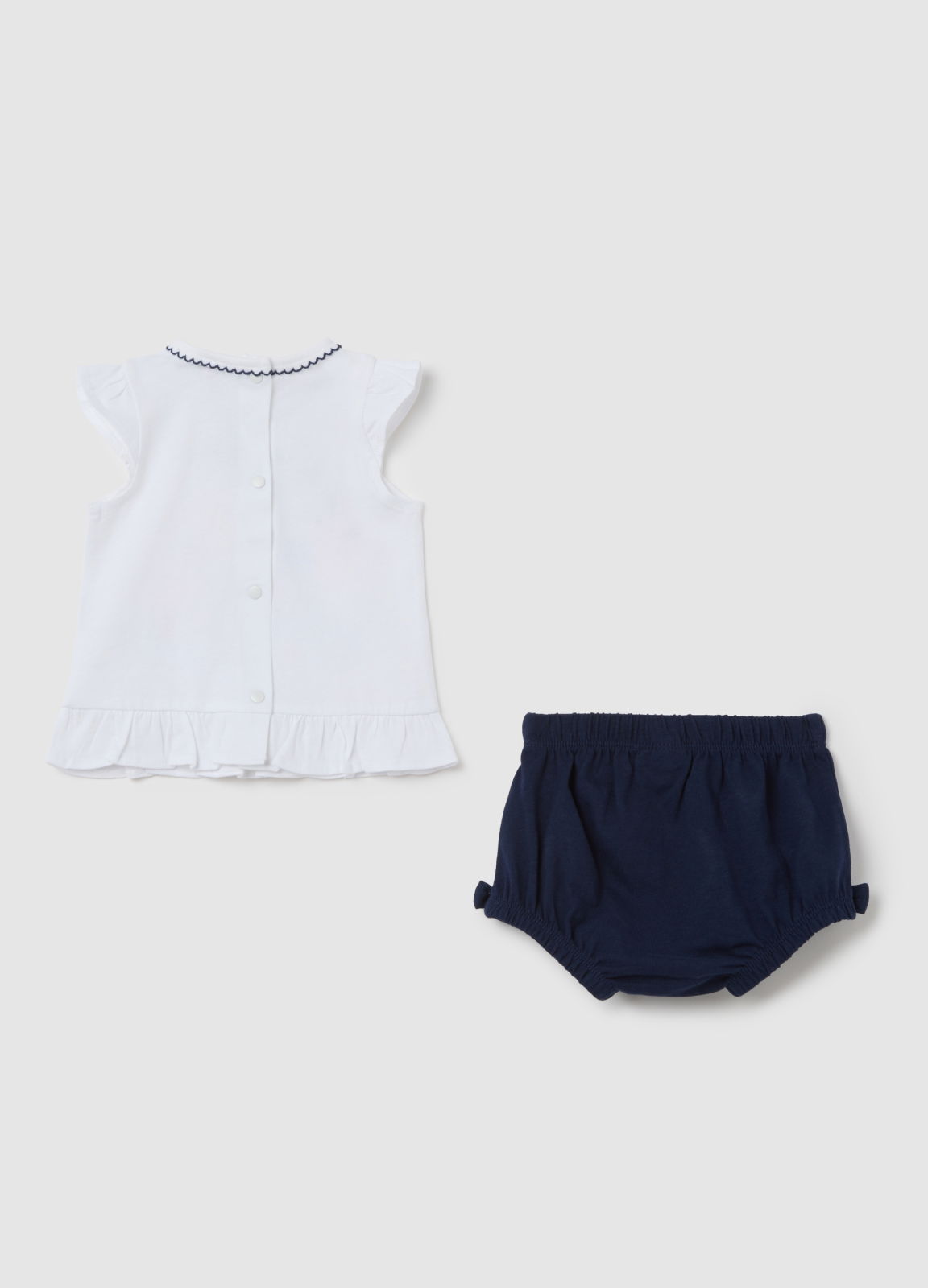 Характеристики: Комплект для новорожденных Fagottino из чистого хлопка. Белая футболка с короткими рукавами и бантиком. Классический воротник с вышивкой. Застежка на пуговицы сзади. Синие шорты с эластичным поясом для гарантированного комфорта.