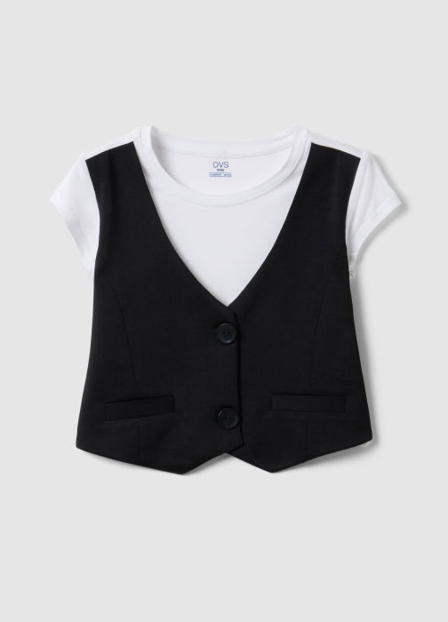 Характеристики: Белая футболка с интегрированной черной жилеткой из линии OVS KIDS сделана из чистой вискозы, предназначена для девочек от 10 до 15 лет. Короткий рукав и обычный крой обеспечивают комфорт и свежесть. Классический круглый вырез и V-образный вырез жилетки делают её универсальной, идеально для любого случая. Оригинальный продукт, легко сочетается с повседневной одеждой.