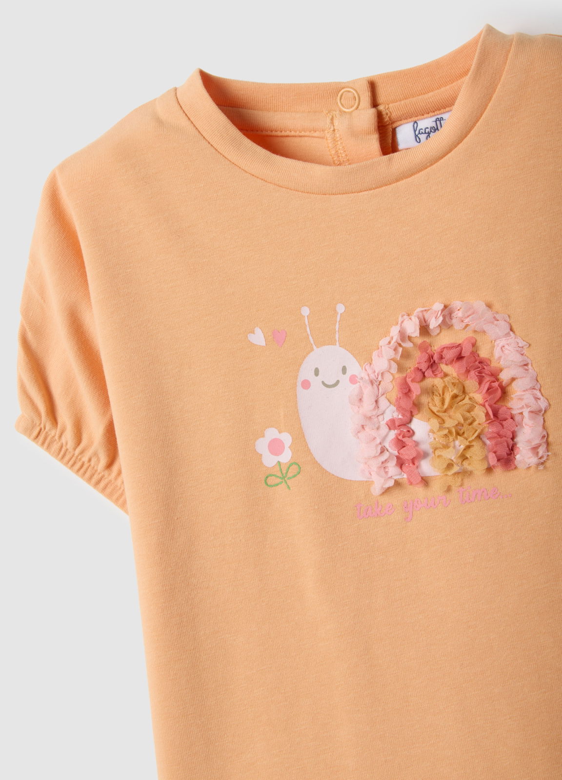 Характеристики: Оранжевая футболка из линии Fagottino выполнена из эластичного хлопка и идеально подходит для добавления яркого акцента в весенне-летний гардероб девочек в возрасте от 9 до 36 месяцев. Круглый вырез и стандартный крой обеспечивают свободу движений. Яркая вышивка с милой улиткой на передней части делает модель веселой и подходящей для игр и отдыха.