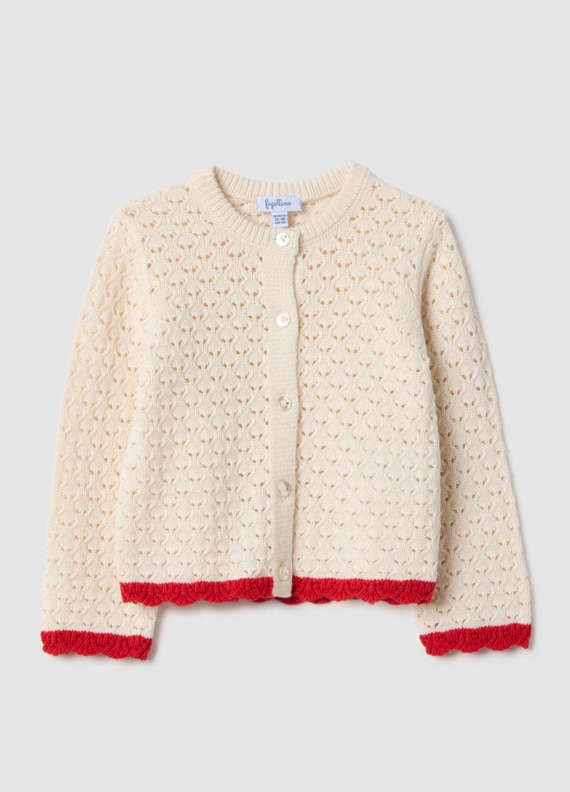 Характеристики: Бежевый кардиган из линии Fagottino сделан из 100% хлопка для девочек от 9 до 36 месяцев. С длинными рукавами, идеально для переходных сезонов. Вязаный узор обеспечивает комфорт и тепло, красная отделка добавляет яркости. Застежка на пуговицы обеспечивает практичность и легкость использования.