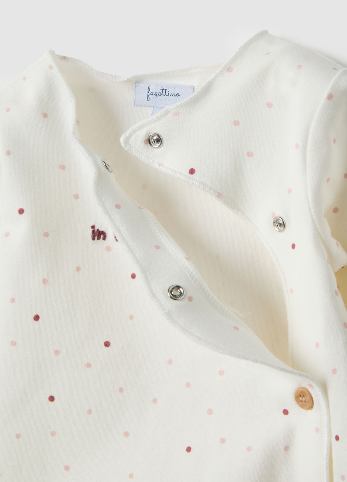 Характеристики: Белый бодик для девочек из чистого хлопка с розовыми горошинами из линии Fagottino идеально подходит для контакта с нежной кожей. Практичная застежка на кнопки и классический воротник обеспечивают комфортную и надежную одежду. Встроенные ножки и длинные рукава обеспечивают дополнительный комфорт в весенние и летние месяцы.