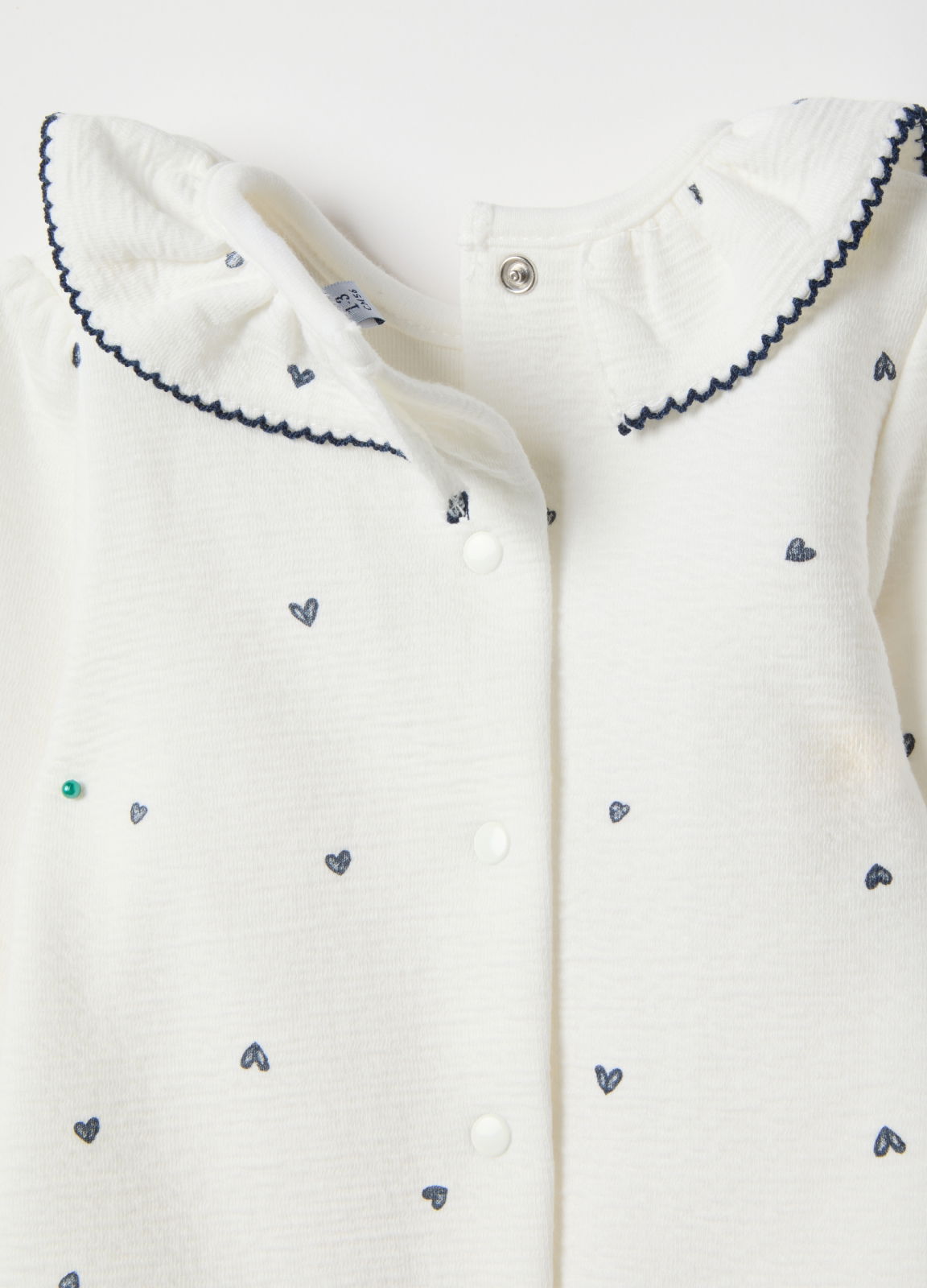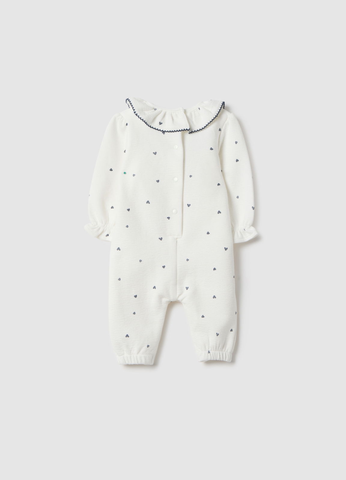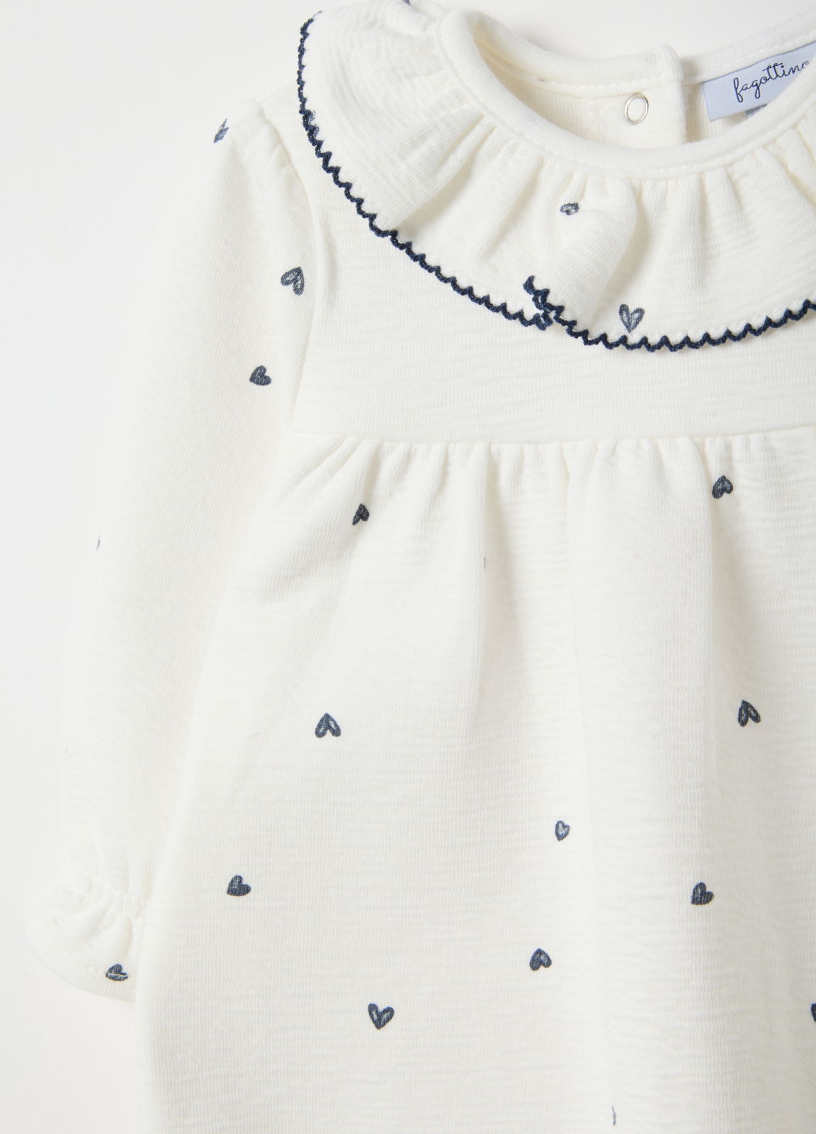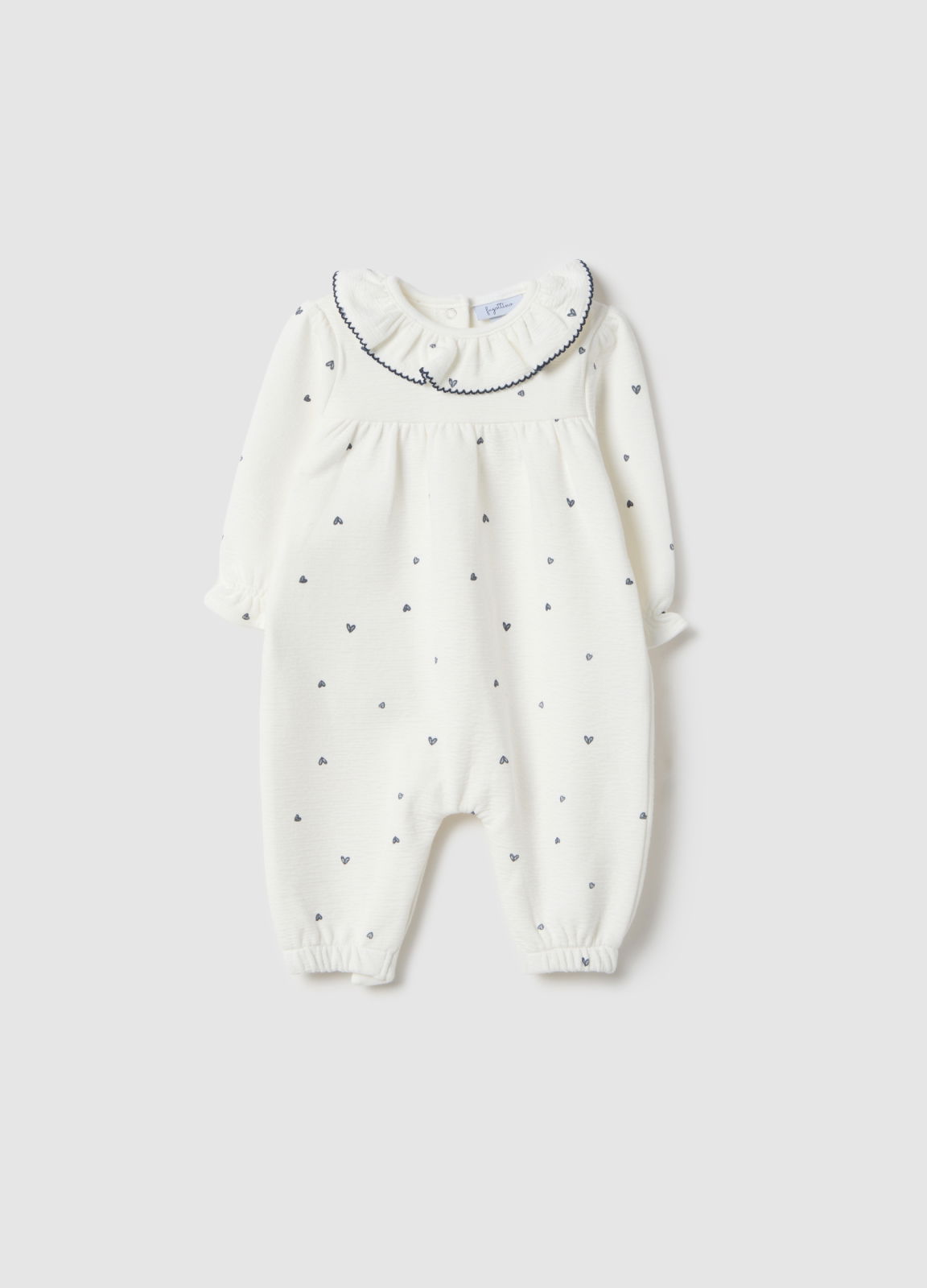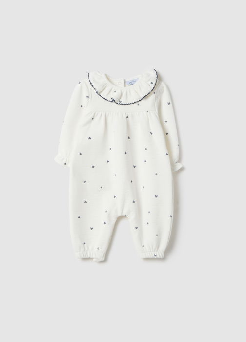 Характеристики: Белый комбинезон для девочек из коллекции Fagottino изготовлен из эластичной хлопковой смеси, обеспечивая комфорт и свободу движений. Узоры в виде сердечек добавляют немного милоты, а классический воротник с рюшами придает нежную элегантность. Застежка-молния на спине облегчает одевание, делая его идеальным для игр.