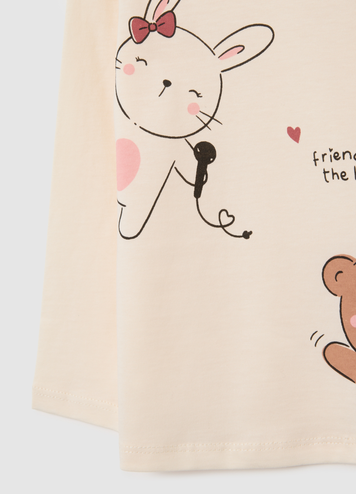 Характеристики: Бежевая футболка линии Fagottino для девочек 9–36 месяцев из чистого хлопка. Принт с милыми животными спереди делает её идеальной для досуга. Круглый вырез и застёжка с пуговицей сзади обеспечивают удобство при ношении.