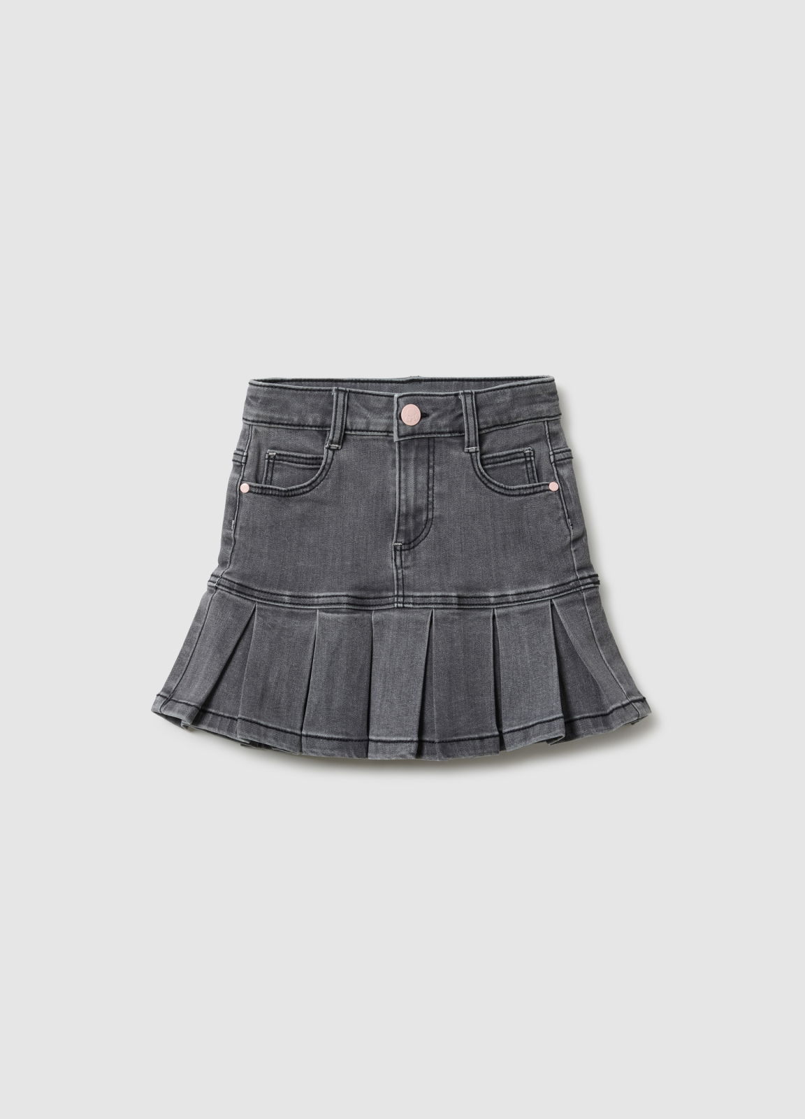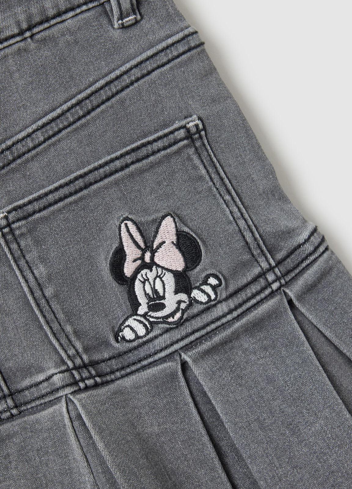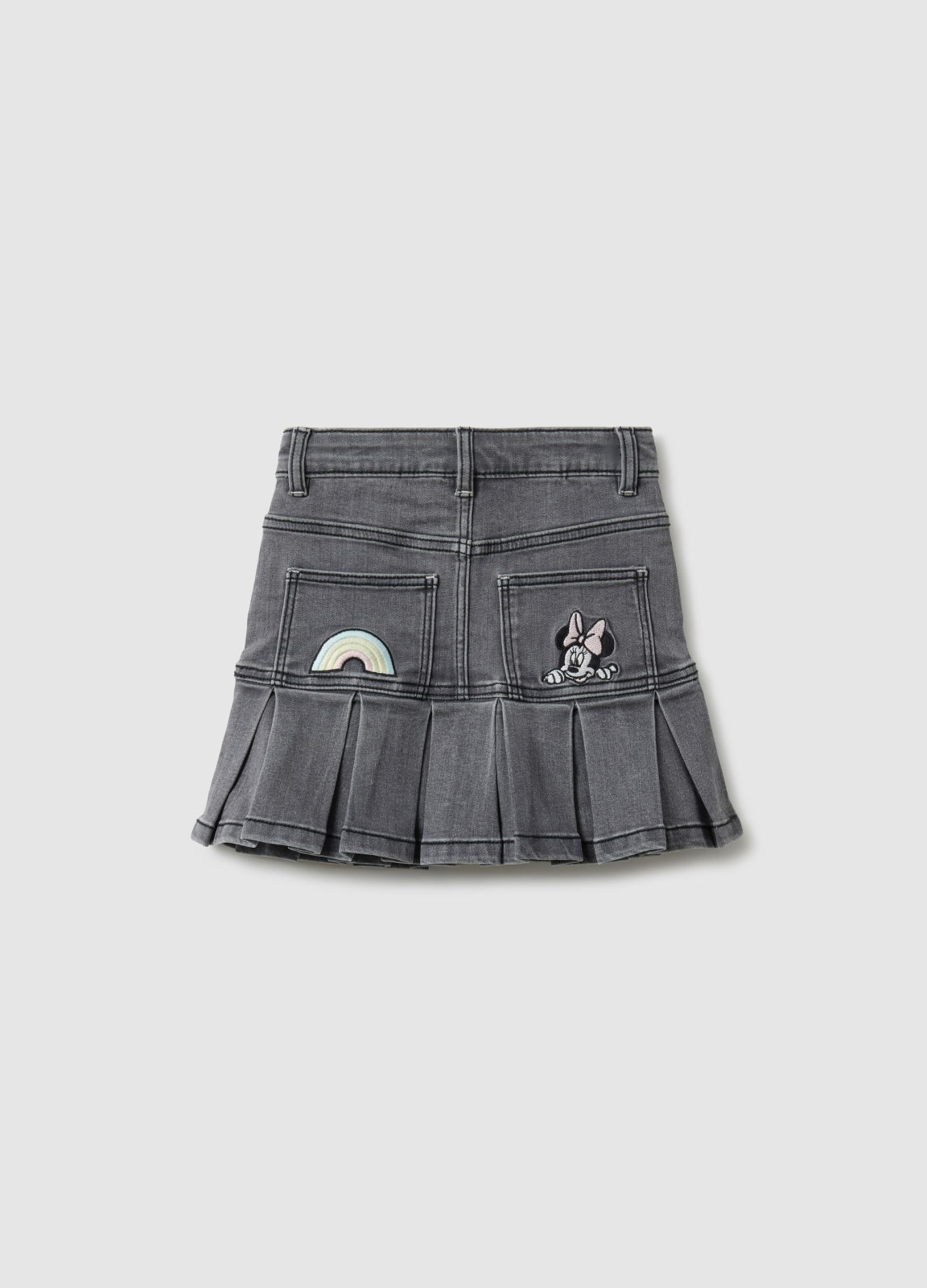 Характеристики: Серая юбка из эластичного денима для девочек 3–10 лет, линия OVS KIDS. Аппликации сзади (радуга и персонажи Disney), регулируемая талия, комфорт и свобода движений.