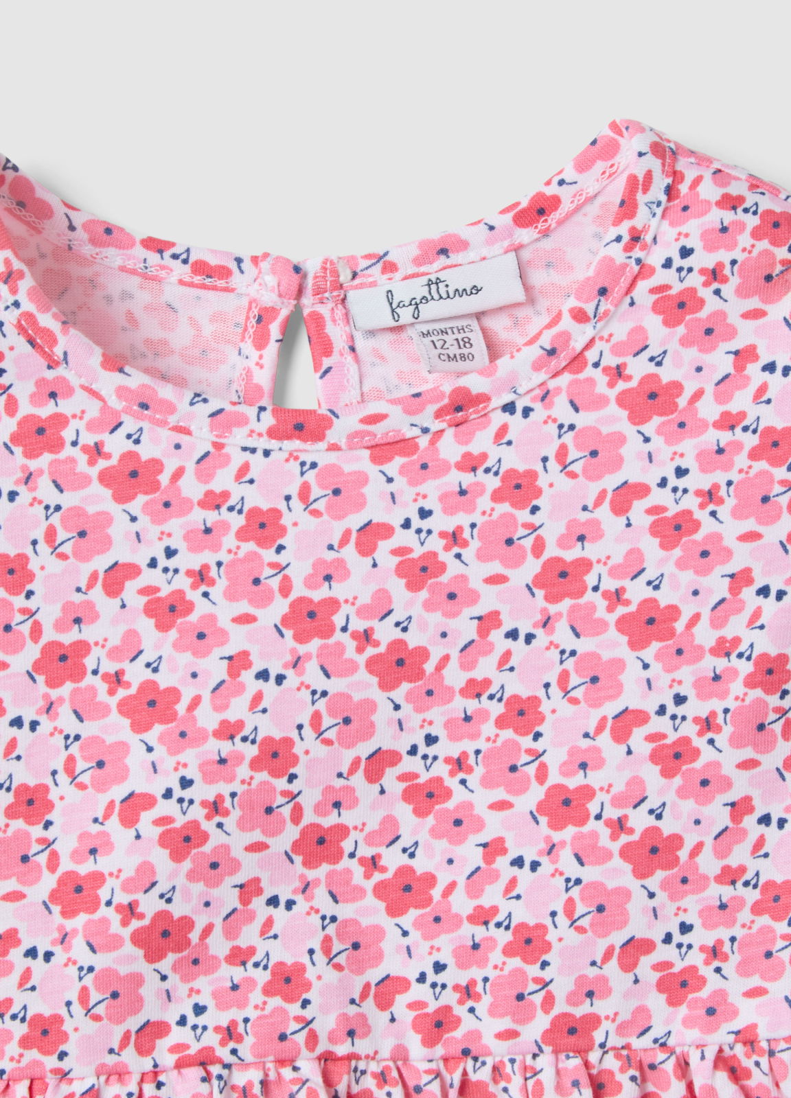 Характеристики: Многоцветное платье линии Fagottino изготовлено из 100% хлопка, обеспечивая комфорт и свободу движений для девочек от 9 до 36 месяцев. Цветочный дизайн, рукава с оборками и круглый вырез создают романтичный и игривый стиль. Застёжка с пуговицами на спине делает платье практичным для летних дней, идеально для любого случая.