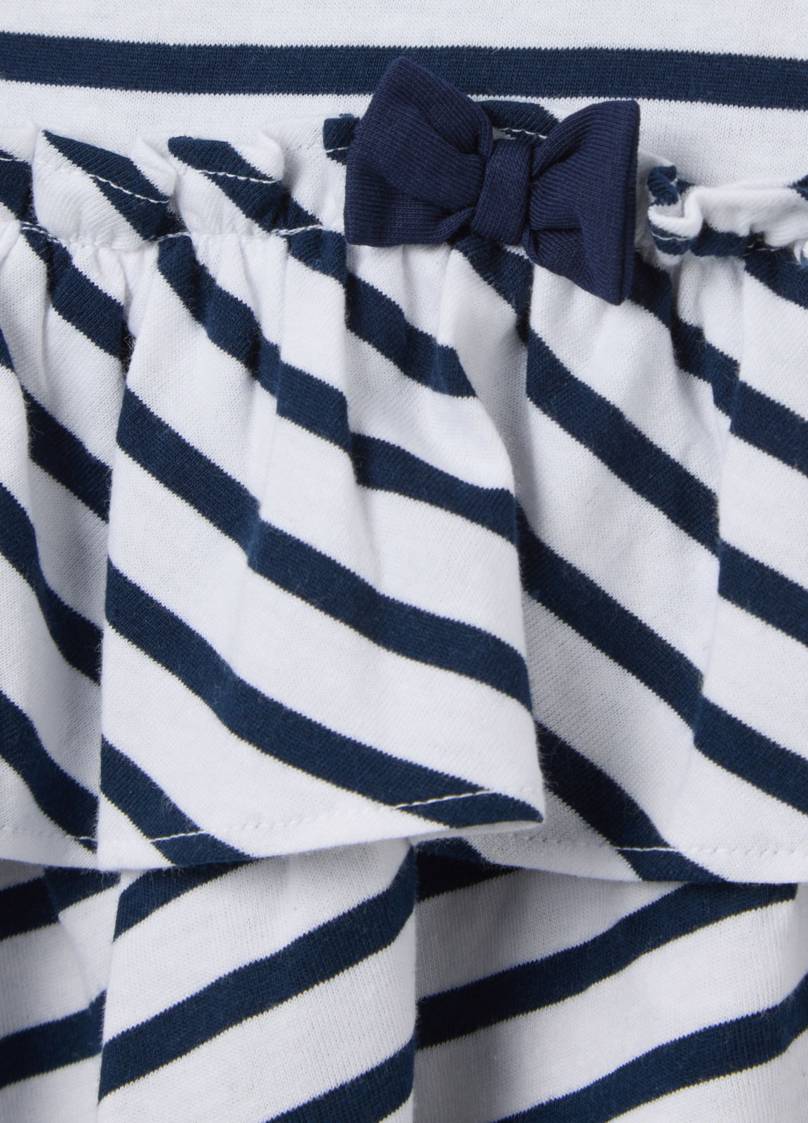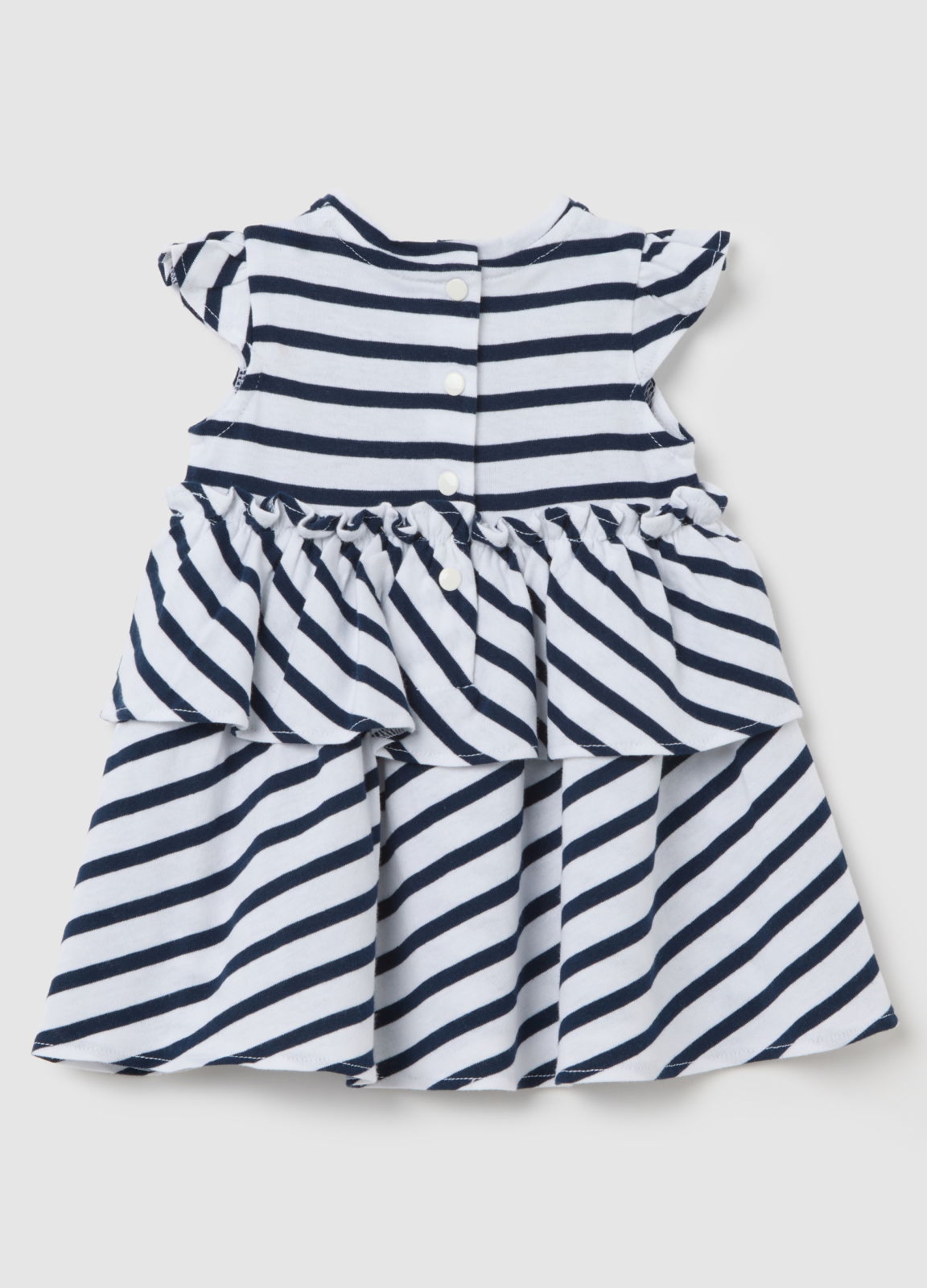 Характеристики: Платье из 100% органического хлопка. Полосатый узор. Круглый воротник с застежкой на пуговицы на спинке. Рукава с рюшами.