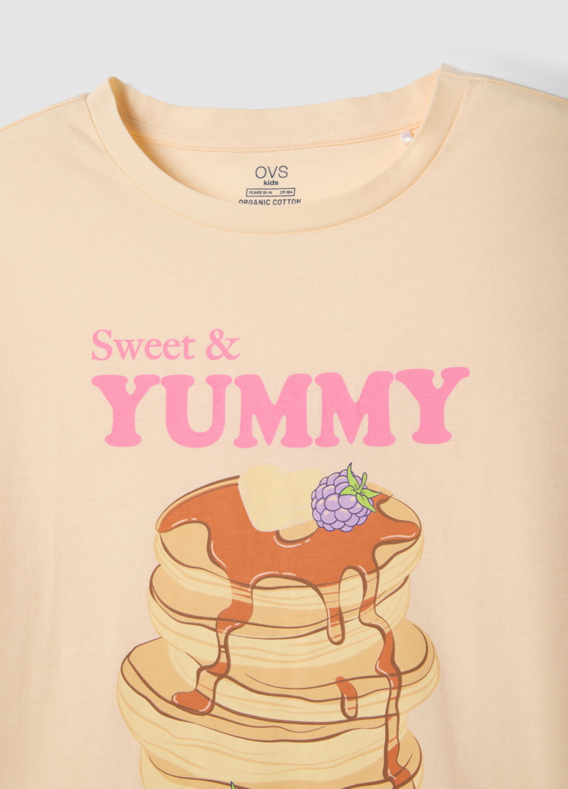Характеристики: Разноцветная пижама из линии OVS KIDS изготовлена из чистого органического хлопка, идеально подходит для летнего отдыха девочек от 9 до 14 лет. Состоит из бежевой футболки с короткими рукавами и принтом с панкейками и фиолетовых шорт. Удобная посадка regular fit обеспечивает свободу движений. Идеально подходит для комфортного сна в тёплые летние ночи.