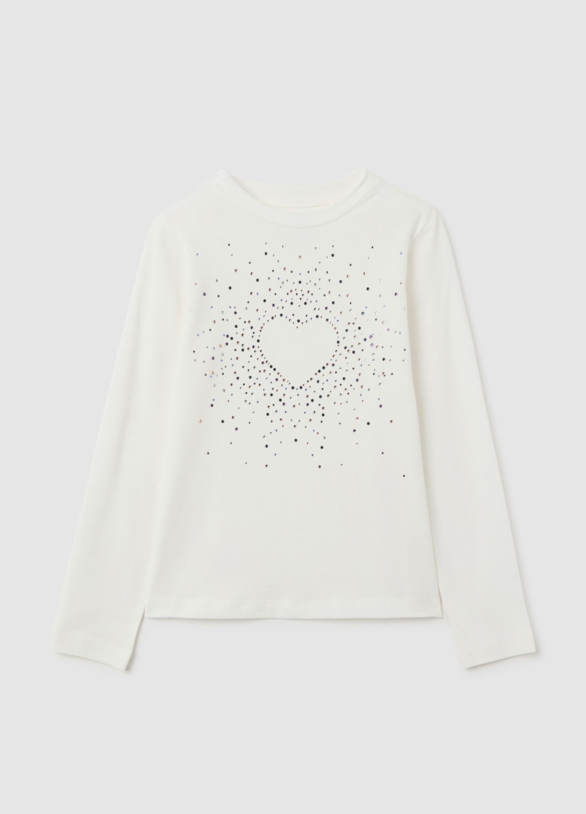 Характеристики: Этот белый хлопковый топ с длинными рукавами для девочек от трех до десяти лет украшен стразами в форме сердечек на передней части. Универсальный предмет одежды, идеально подходящий для осенне-зимнего сезона, обеспечивает комфорт и стиль. Отлично подходит для тех, кто хочет добавить блеска в повседневный образ, не жертвуя практичностью.