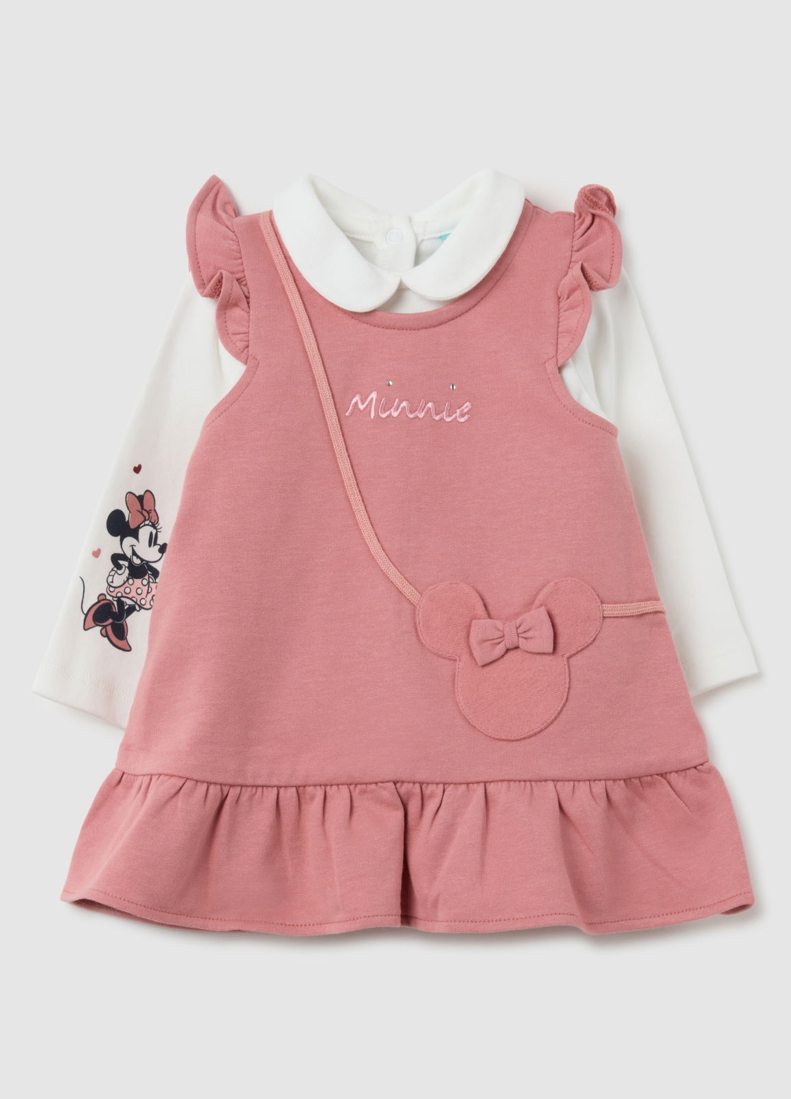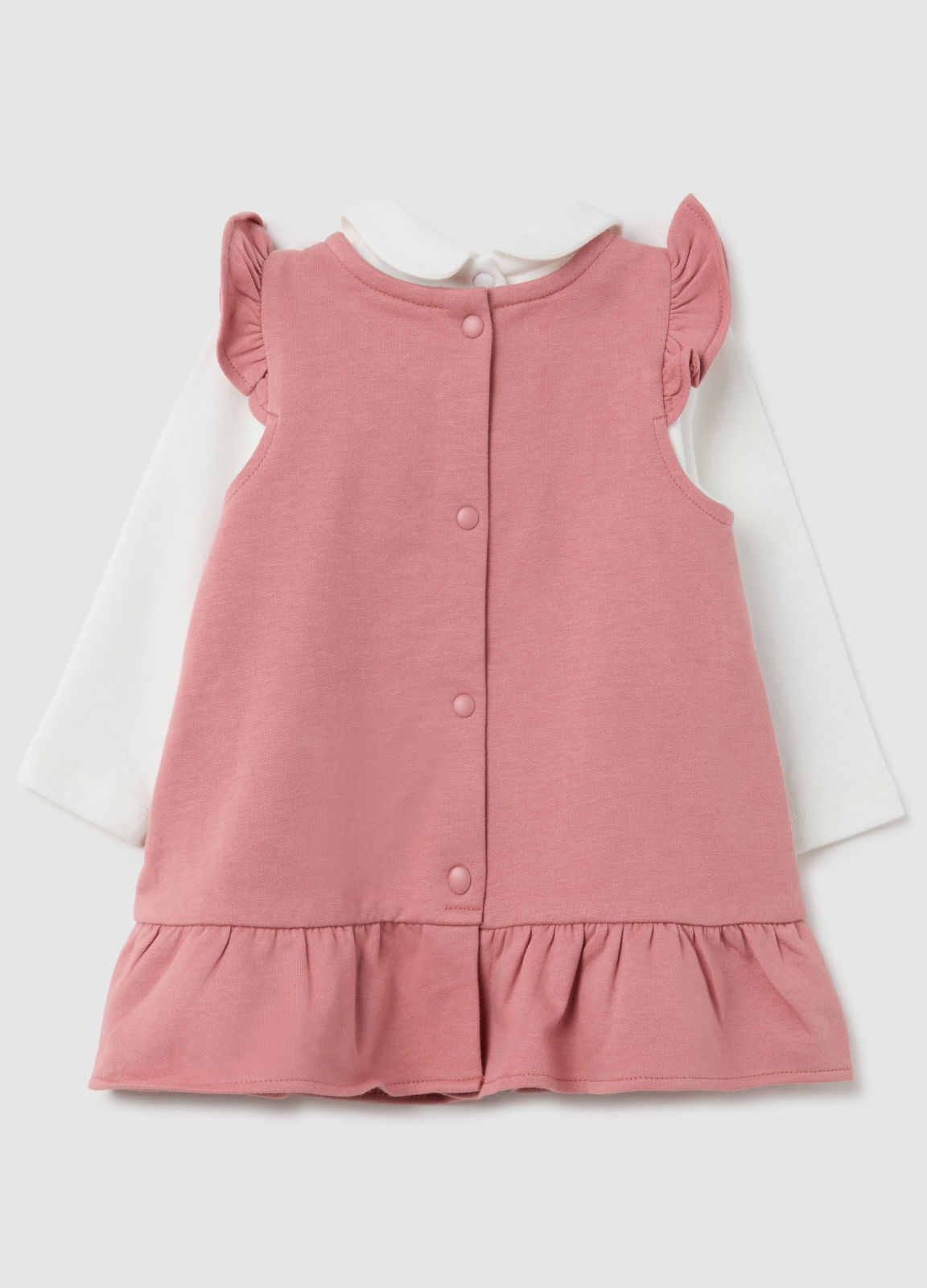 Caracteristici: Această ținută pentru fetițe, din bumbac pur multicolor, este formată dintr-o rochiță roz cu volănașe și o bluză albă cu mânecă lungă. Ideală pentru lunile mai răcoroase, datorită texturii moi a materialului. Volănașele adaugă un aer adorabil, iar gulerul rotund completează un stil clasic și elegant.