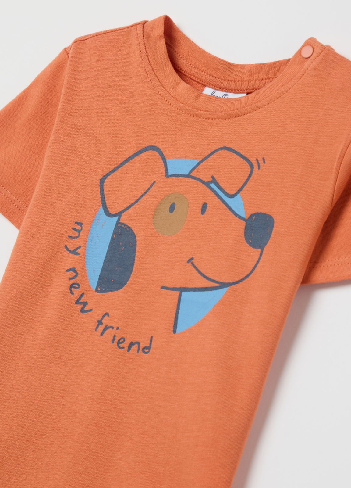 Caracteristici: Tricou 100% bumbac. Guler rotund cu capse pe umăr. Print cu cățeluș și lettering ''My new friend'' pe față.
