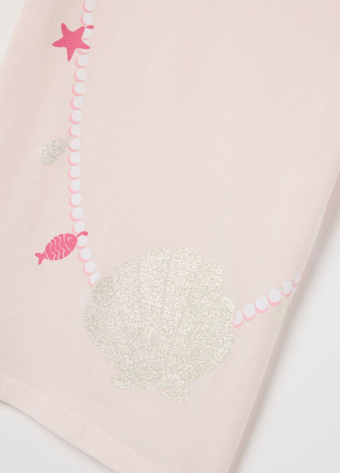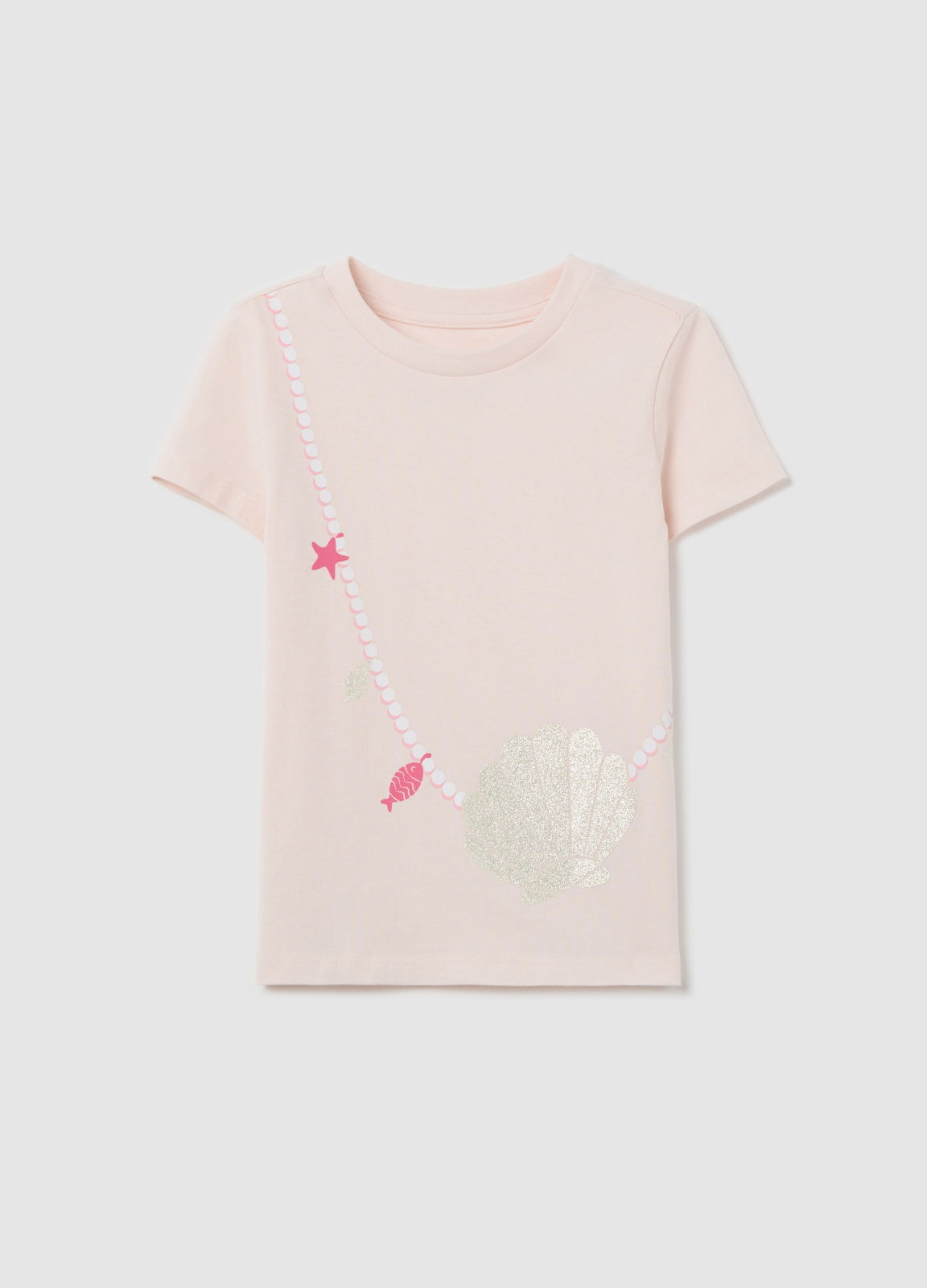 Caracteristici: Tricou din 100% bumbac. Guler rotund și mâneci scurte. Imprimeu cu geantă în formă de scoică sclipitoare pe față.