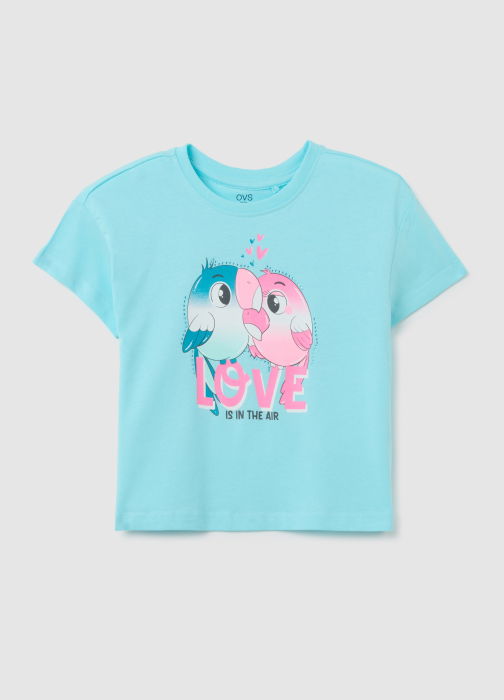 Tip Produs: Tricou azuriu pentru fată, din bumbac pur, croială regular fit, cu imprimeu